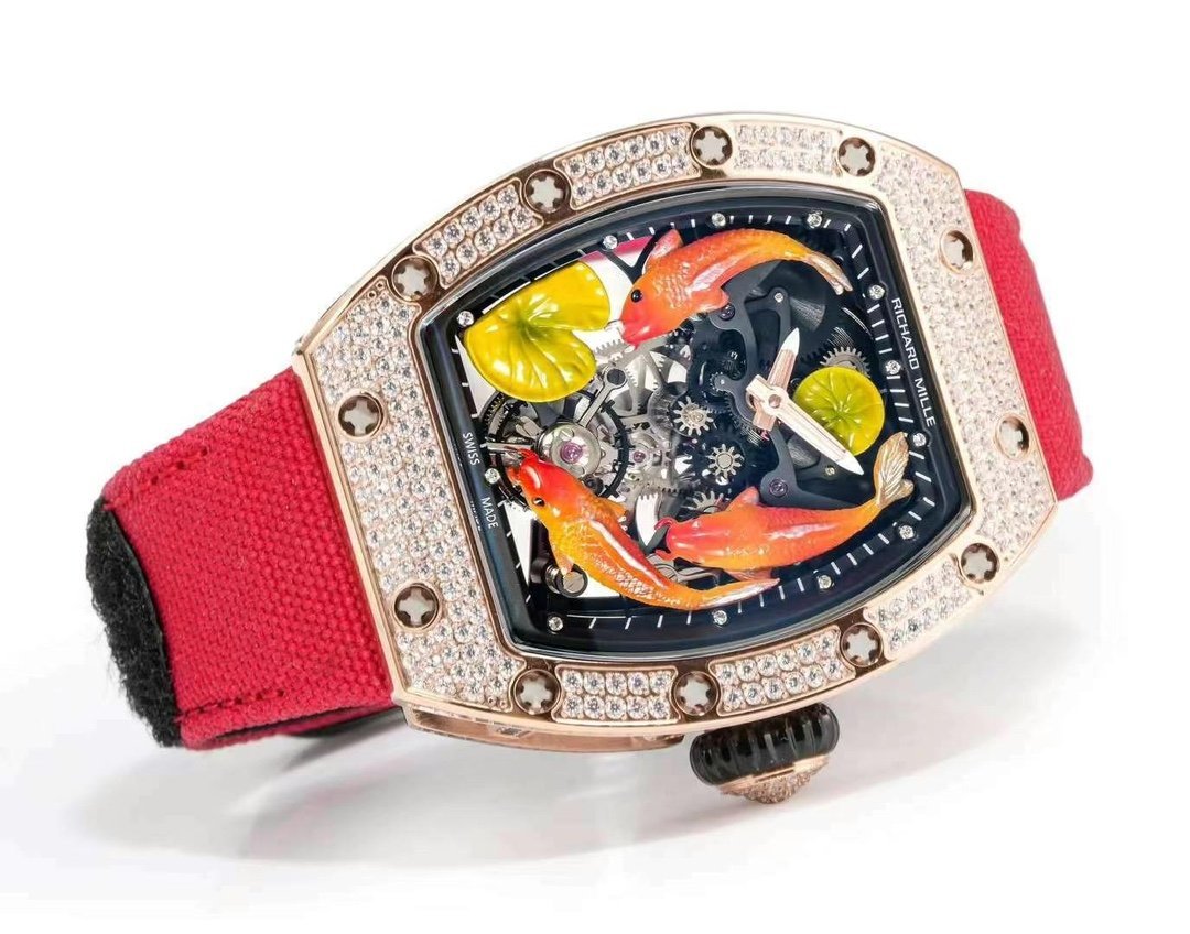 The RICHARD MILLE RM S10 Koi Tourbillon Watch is distinguished by excellent craftsmanship and cultural wealth, realizing the legendary Koi carp of the Oriental world on the face of the watch. The lively spectacle of Koi gracefully swimming in a pond is embellished with red gold and diamond-encrusted highlights, providing breathtaking beauty. This exclusive edition of the tourbillon watch, featuring a red Koi design, is the only model of its kind to be launched in China, making it an absolute collector’s treasure. With three meticulously crafted and lifelike Koi fish swimming in this mechanical pond, the combination of the tourbillon and Koi is believed to bring luck and fortune—making it a favorite among Chinese watch enthusiasts.