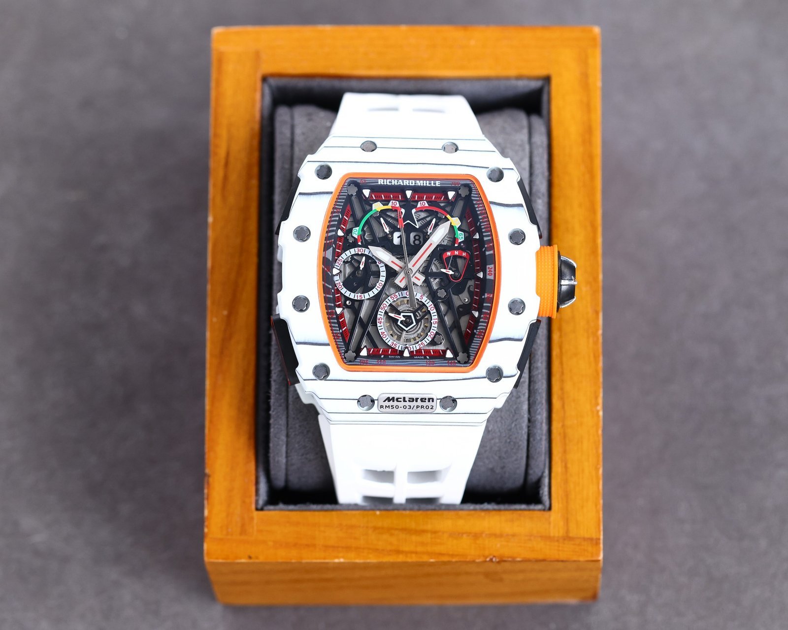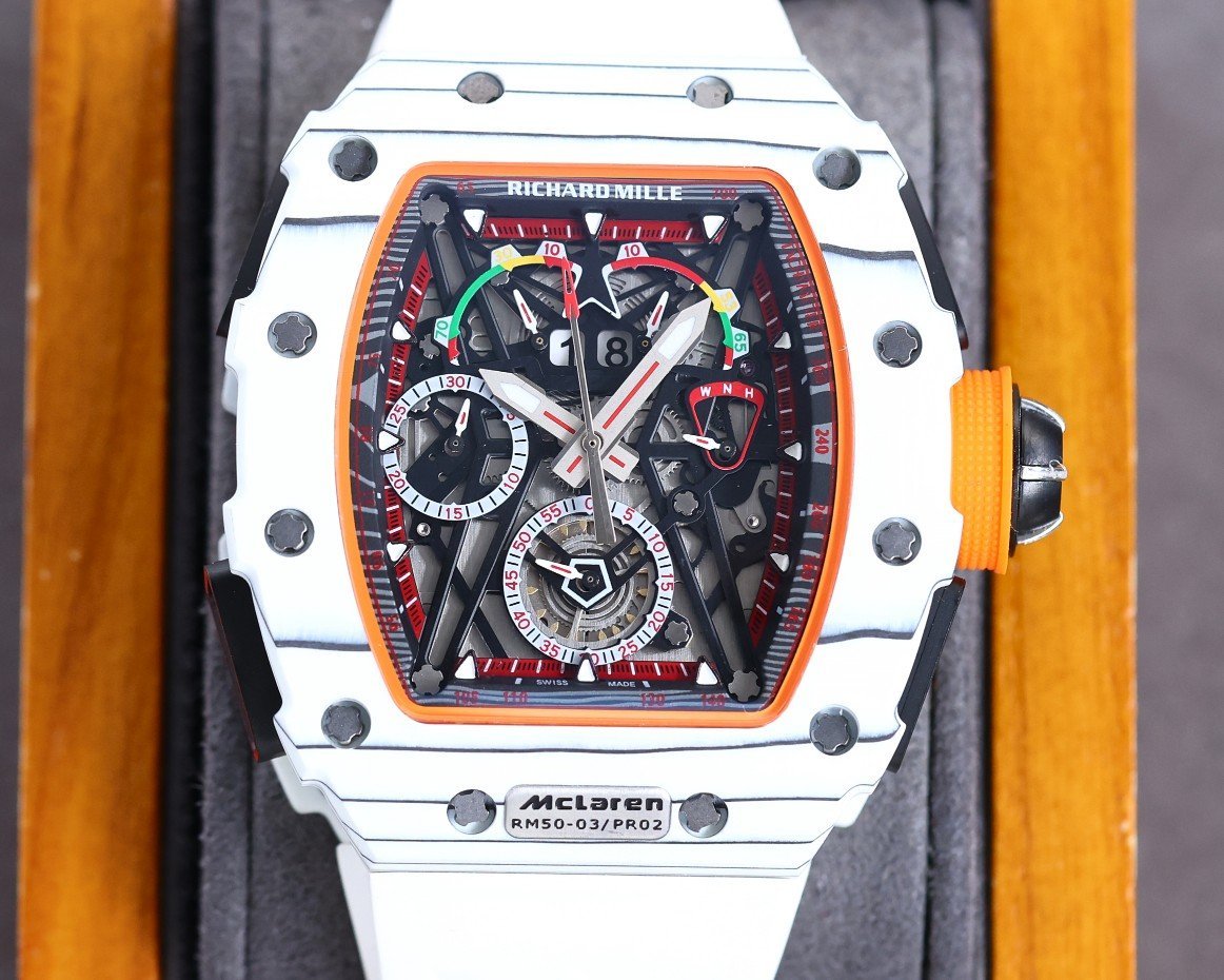 Replica Richard Mille RM50-03 Super Clone Chronograph Mechanical Watch – White Carbon Fiber Case — Premium 1:1 super clone. Case: Titanium / carbon composite tonneau case. Crystal: Genuine sapphire crystal front and back. Movement: Clone RM caliber (skeletonized automatic). 12-month movement warranty. Free worldwide shipping on orders over $1,200.