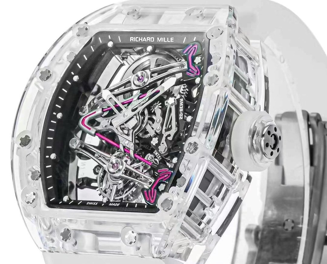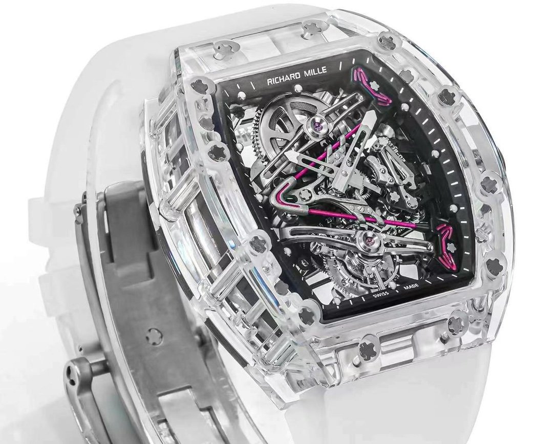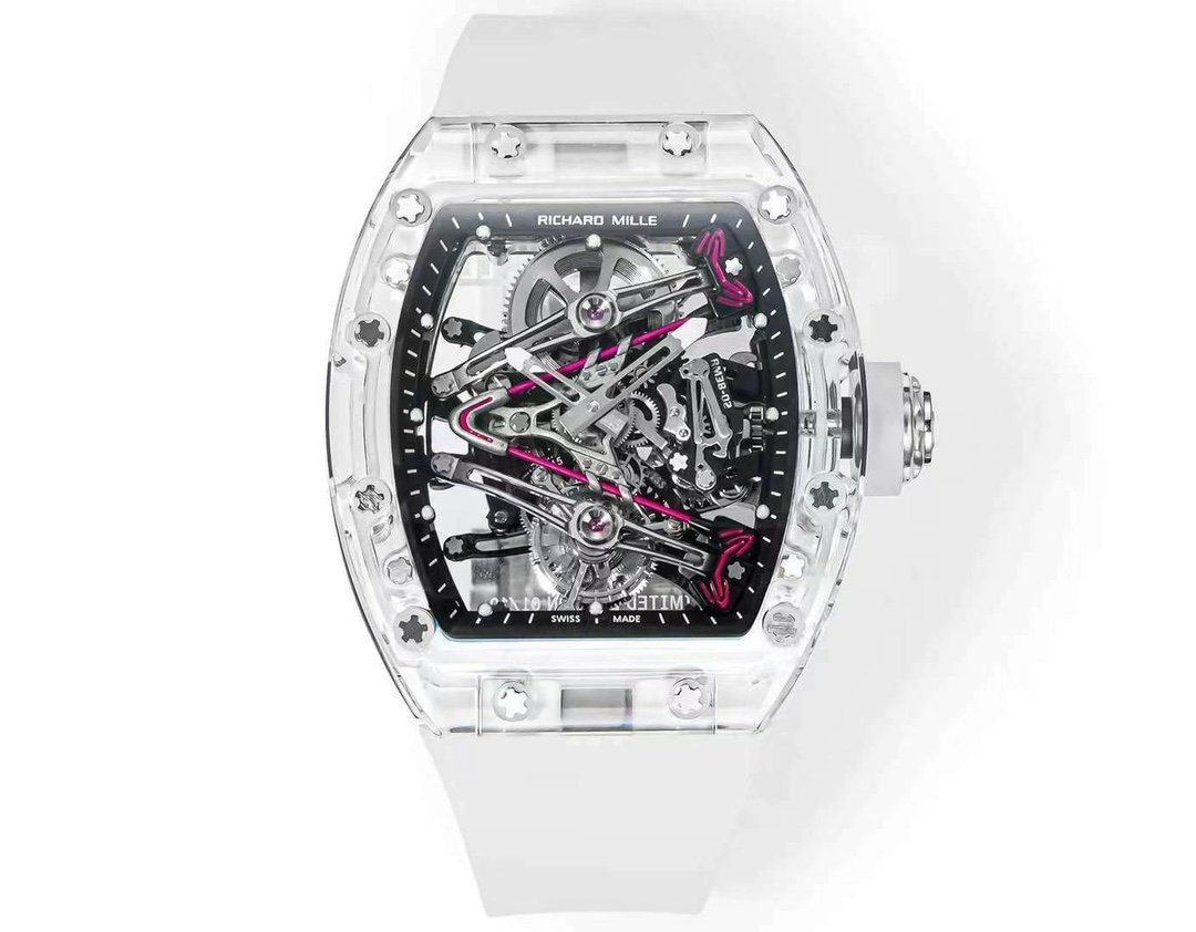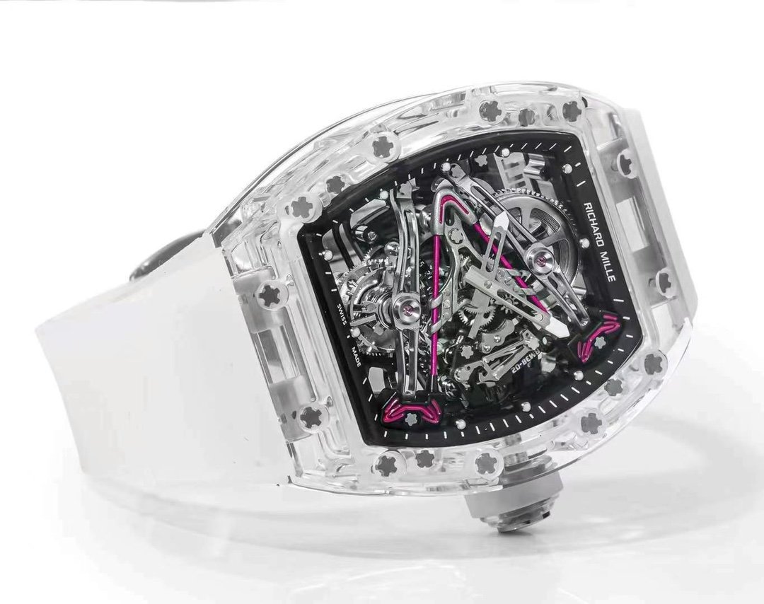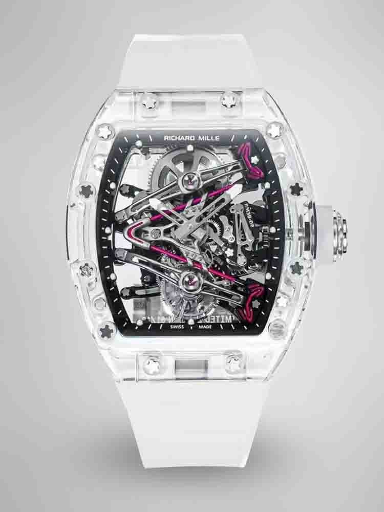 The RM 38-02 Crystal Pink Skeleton Tourbillon is a stunning piece that showcases a perfect fusion of art and engineering. The 41mm x 50mm transparent crystal case allows a full 360° view of the intricate Swiss movement. The skeleton dial features a V-shaped bridge, with a hand-painted pink pattern inspired by Bubba Watson’s golf club head. TWith its Swiss movement, sapphire glass and rubber strap, this watch has a modern and elegant look and is water-resistant to 50 meters. A true tribute to mechanical craftsmanship.