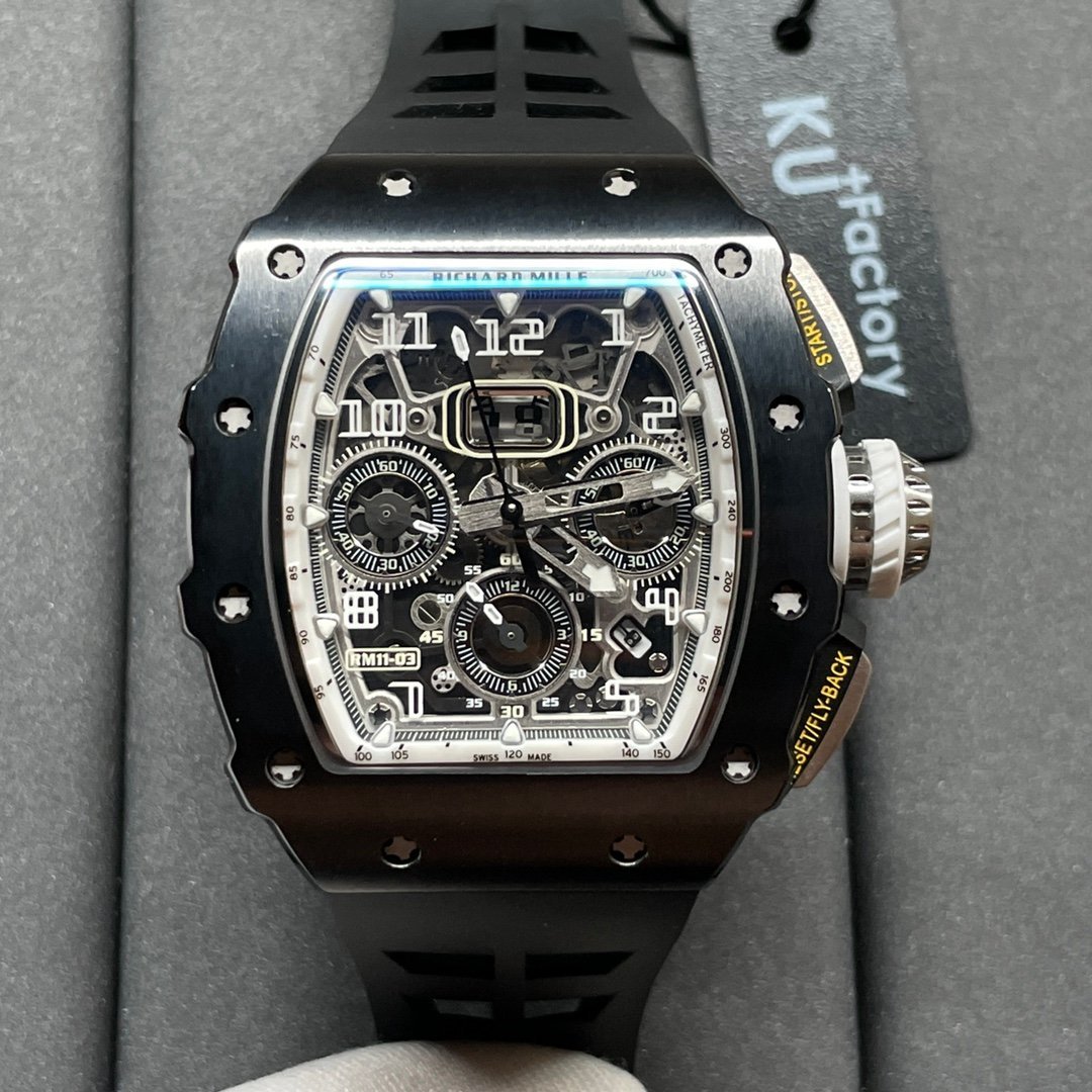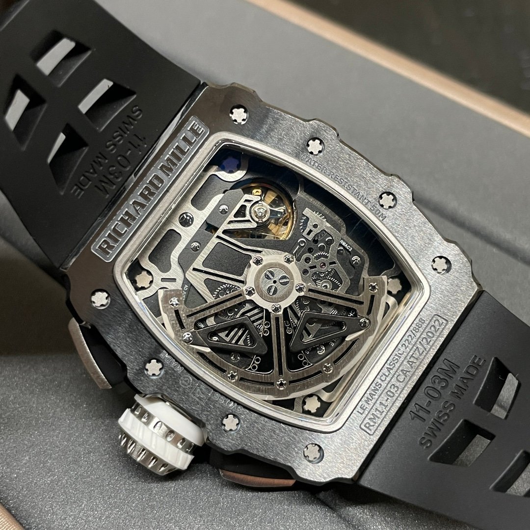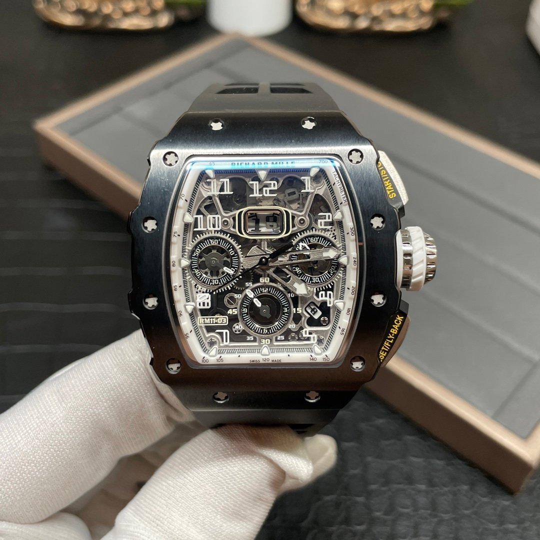 Richard Mille RM 11-03 Replica Black Ceramic Case with Black Rubber Strap | Skeleton Dial Watch For Men — Premium 1:1 super clone. Case: Titanium / carbon composite tonneau case. Crystal: Genuine sapphire crystal front and back. Movement: Clone RM caliber (skeletonized automatic). 12-month movement warranty. Free worldwide shipping on orders over $1,200.