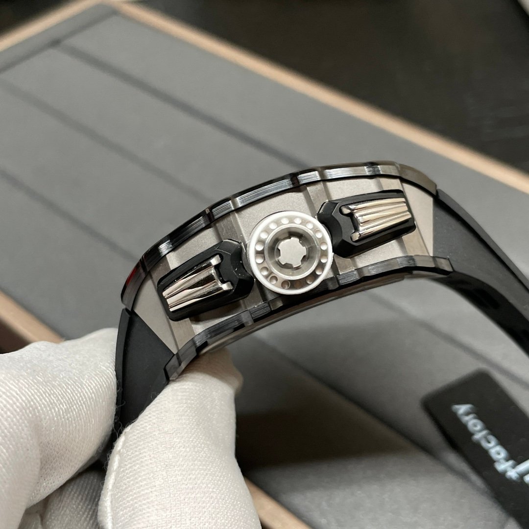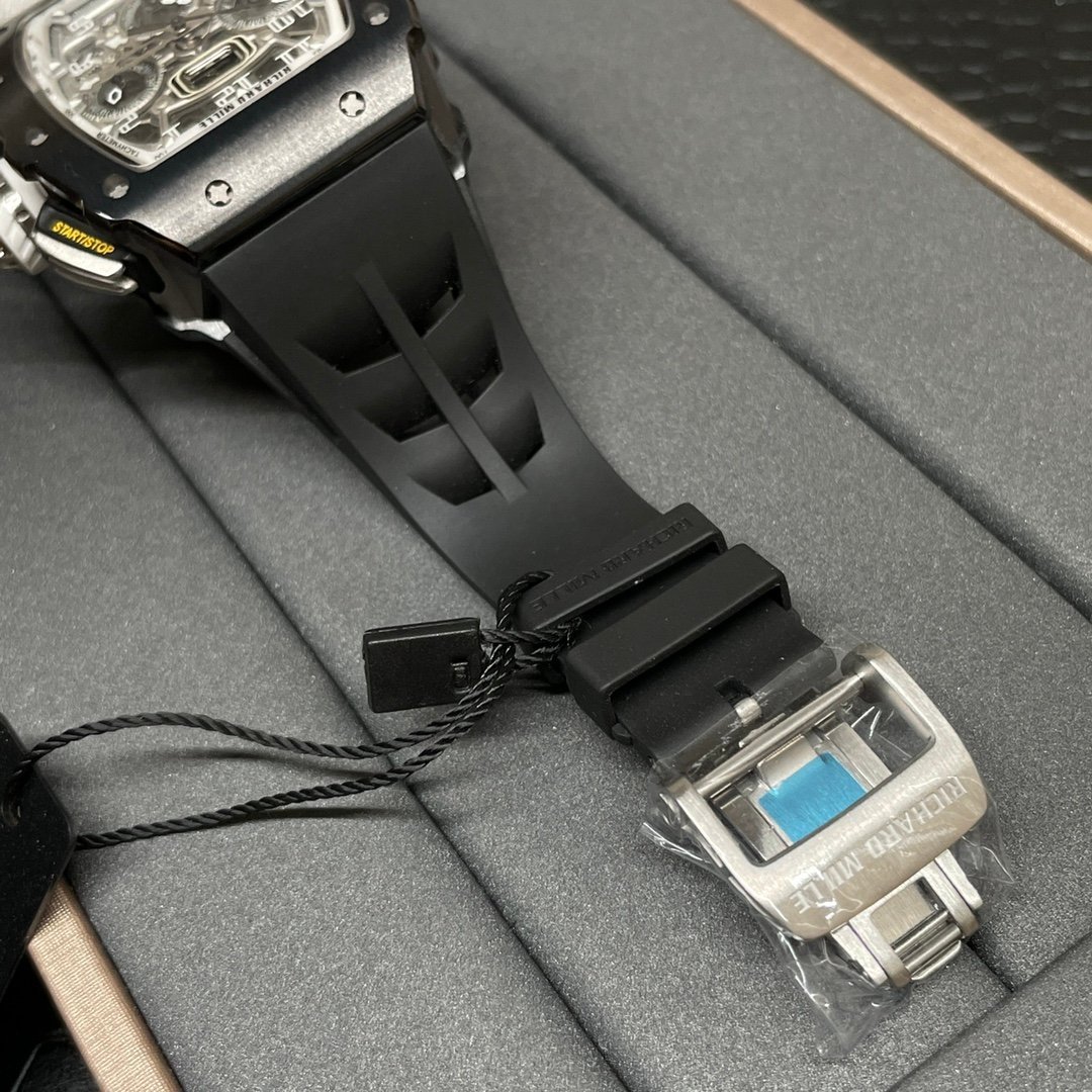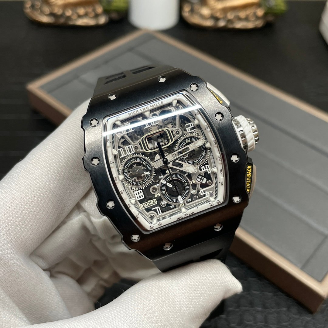 Richard Mille RM 11-03 Replica Black Ceramic Case with Black Rubber Strap | Skeleton Dial Watch For Men — Premium 1:1 super clone. Case: Titanium / carbon composite tonneau case. Crystal: Genuine sapphire crystal front and back. Movement: Clone RM caliber (skeletonized automatic). 12-month movement warranty. Free worldwide shipping on orders over $1,200.