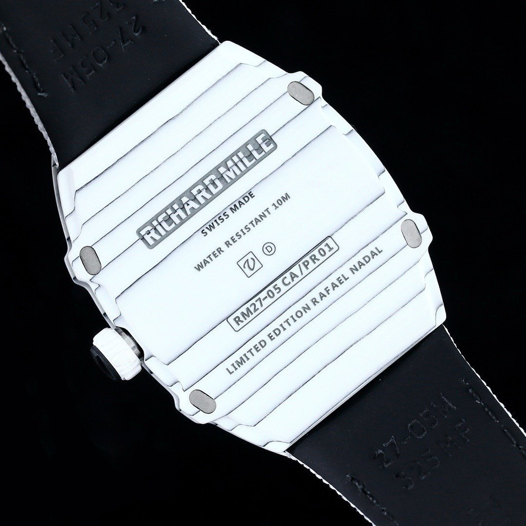Richard Mille RM 27-05 Rafael Nadal Super Clone Ultra Lightweight Flying Tourbillon Replica Watch — Premium 1:1 super clone. Case: Titanium / carbon composite tonneau case. Crystal: Genuine sapphire crystal front and back. Movement: Clone RM caliber (skeletonized automatic). 12-month movement warranty. Free worldwide shipping on orders over $1,200.