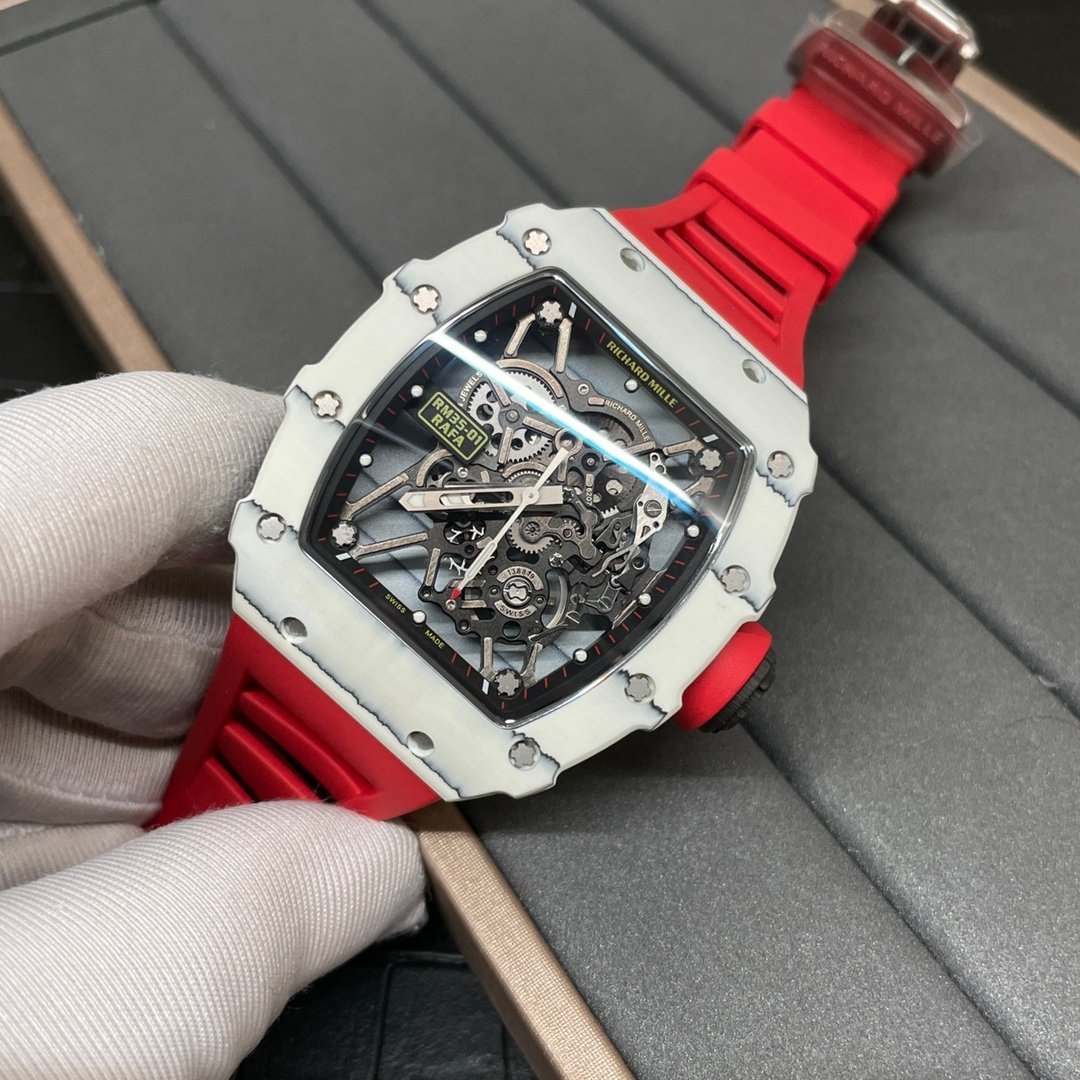 Richard Mille RM 35-01 Replica Rafael Nadal White Carbon Case Red Strap Watch | Swiss Movement, Skeleton Dial — Premium 1:1 super clone. Case: Titanium / carbon composite tonneau case. Crystal: Genuine sapphire crystal front and back. Movement: Clone RM caliber (skeletonized automatic). 12-month movement warranty. Free worldwide shipping on orders over $1,200.