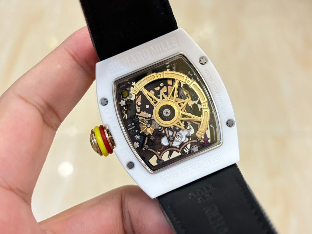 Richard Mille RM 88 Replica AAA – White Ceramic, Black Strap, Swiss Tourbillon Look — Premium 1:1 super clone. Case: Titanium / carbon composite tonneau case. Crystal: Genuine sapphire crystal front and back. Movement: Clone RM caliber (skeletonized automatic). 12-month movement warranty. Free worldwide shipping on orders over $1,200.