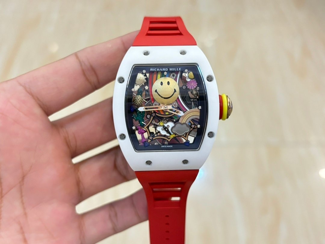 Richard Mille RM 88 Smiley Automatic Tourbillon Watch Replica, Red Rubber Strap — Premium 1:1 super clone. Case: Titanium / carbon composite tonneau case. Crystal: Genuine sapphire crystal front and back. Movement: Clone RM caliber (skeletonized automatic). 12-month movement warranty. Free worldwide shipping on orders over $1,200.