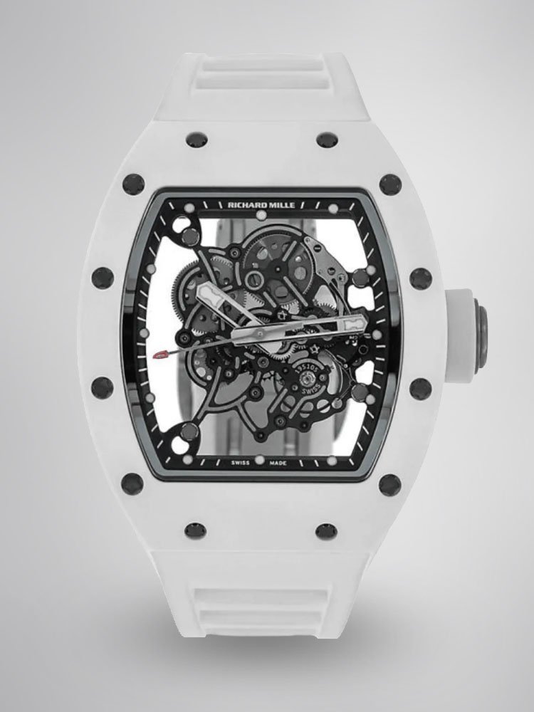 Richard Mille RM055 BBR White Ceramic Skeleton Swiss Replica Sports Watch, AAA Super Clone — Premium 1:1 super clone. Case: Titanium / carbon composite tonneau case. Crystal: Genuine sapphire crystal front and back. Movement: Clone RM caliber (skeletonized automatic). 12-month movement warranty. Free worldwide shipping on orders over $1,200.