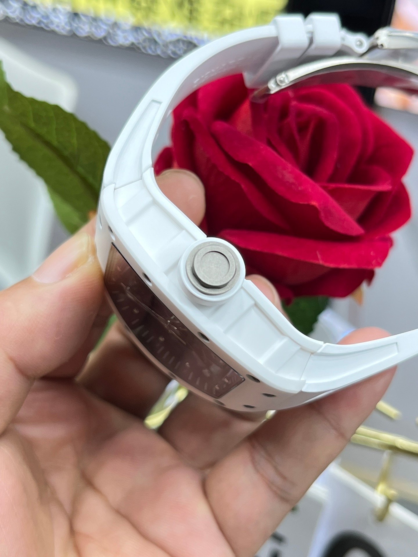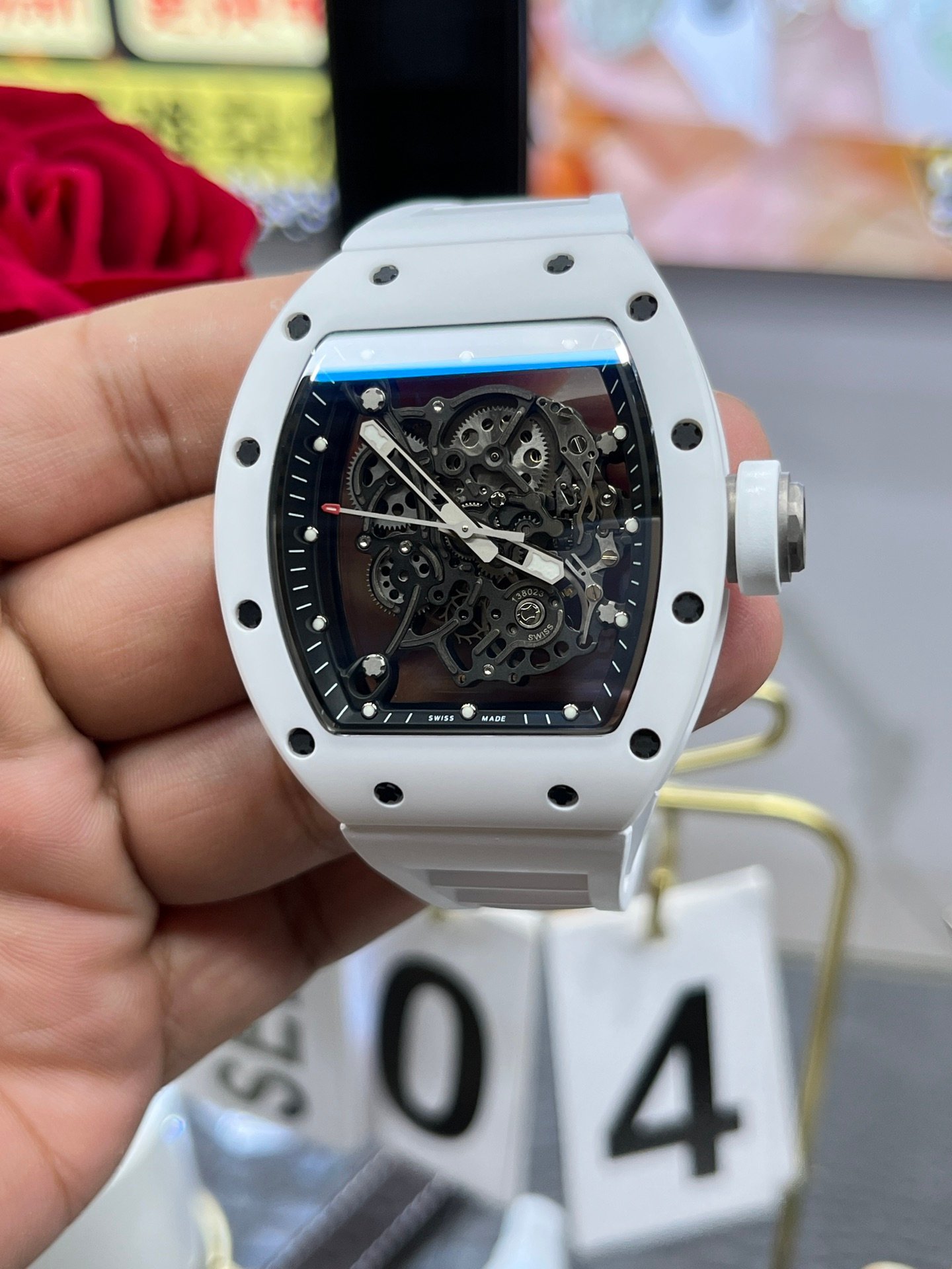 The Richard Mille RM055 BBR White Ceramic Skeleton watch is a luxury sports watch of exceptional design, this one watch has performance and style for everyone. Crafted with a Swiss movement and housed in a durable white ceramic case, it features a unique tonneau-shaped dial and a hollow skeletonized base to showcase the intricate movement inside. The white rubber strap is comfortable to wear, perfect for both casual and formal occasions. Water-resistant to 50 meters, this watch is not only for display, but also for practical functions. This AAA Super Clone watch is a true Swiss replica and a perfect addition to any collection.