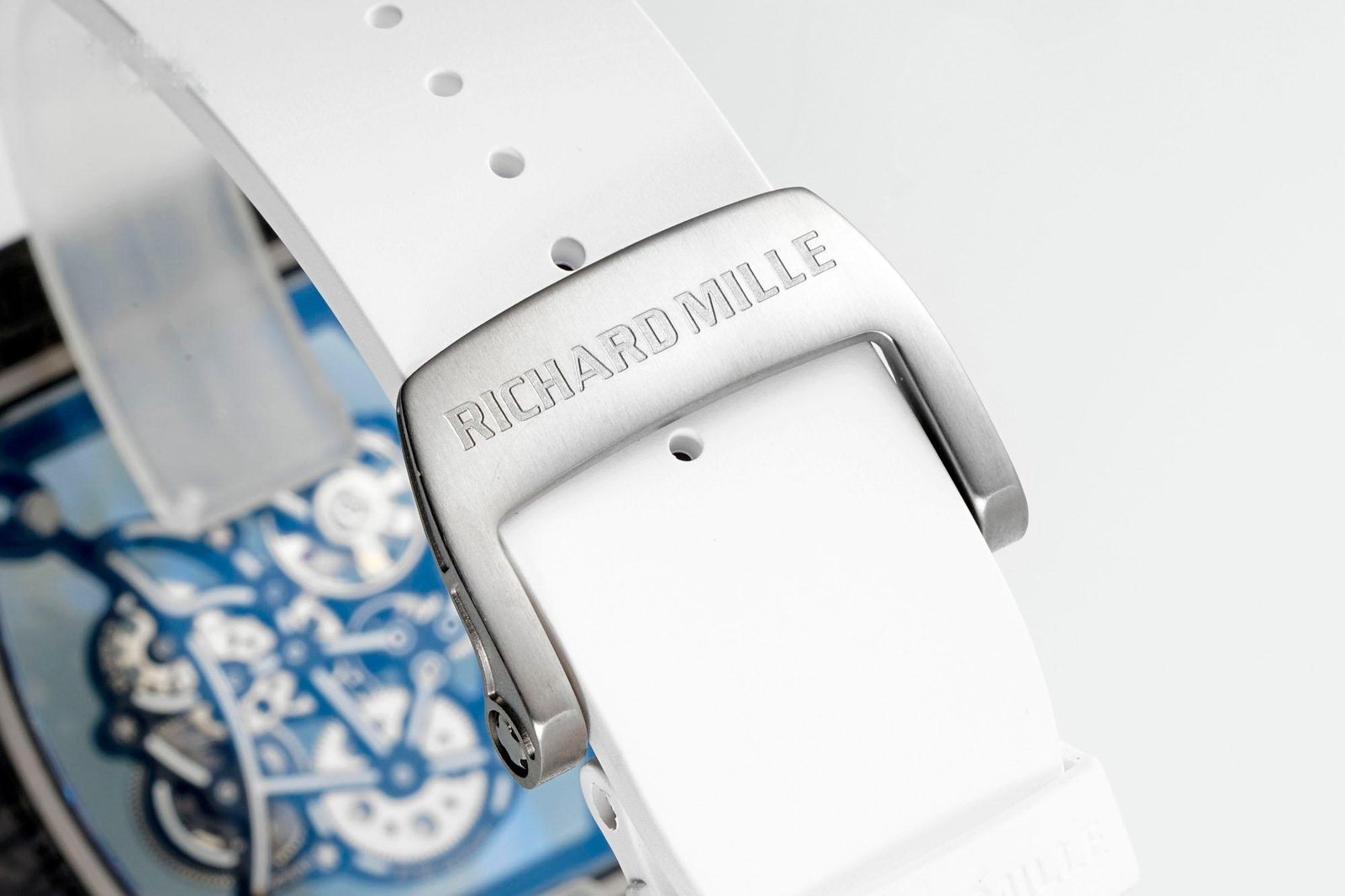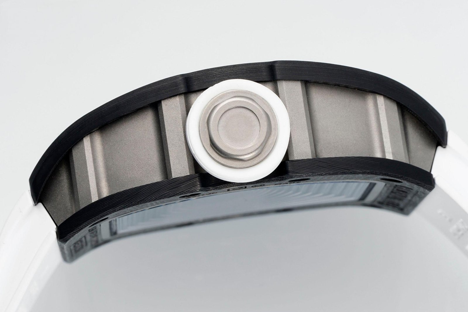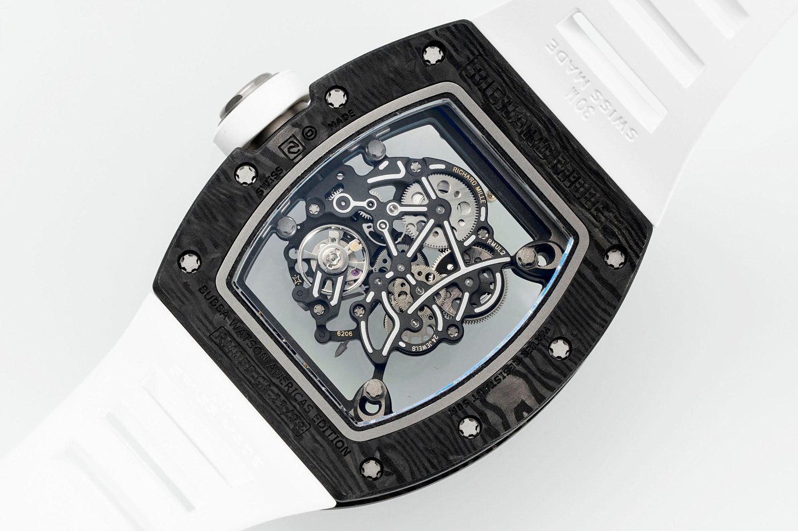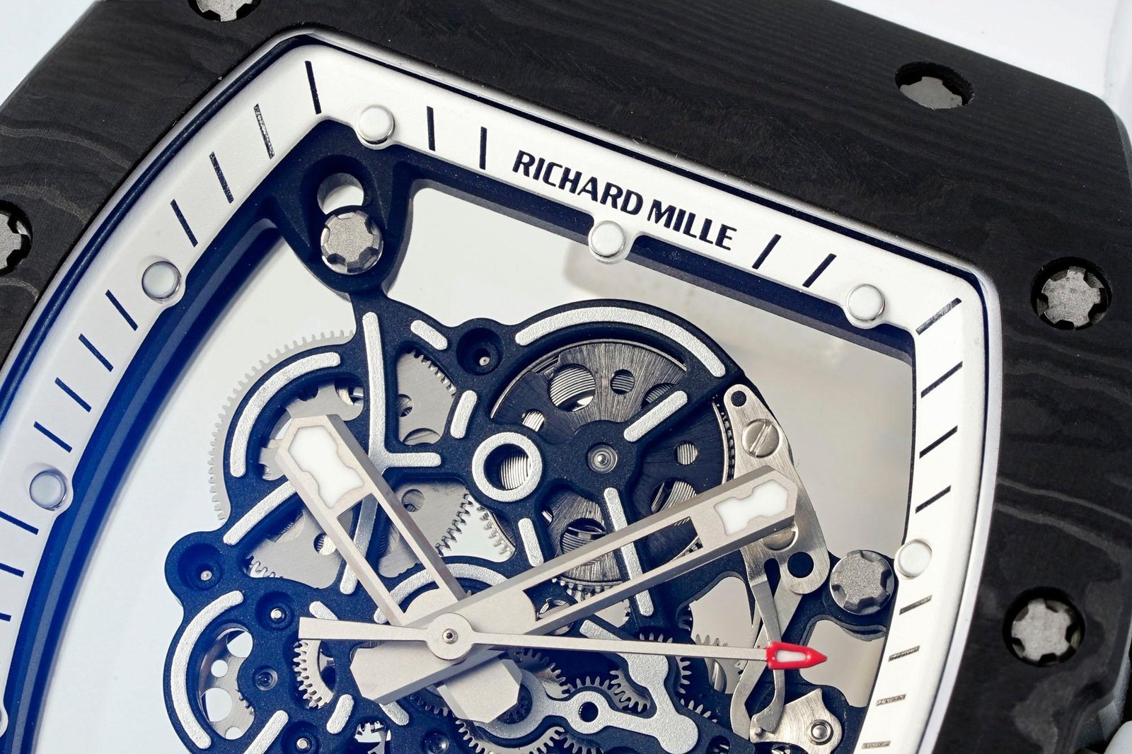 Richard Mille RM055 Skeleton Swiss Replica, Titanium Carbon Fiber Case, White Rubber Strap — Premium 1:1 super clone. Case: Titanium / carbon composite tonneau case. Crystal: Genuine sapphire crystal front and back. Movement: Clone RM caliber (skeletonized automatic). 12-month movement warranty. Free worldwide shipping on orders over $1,200.
