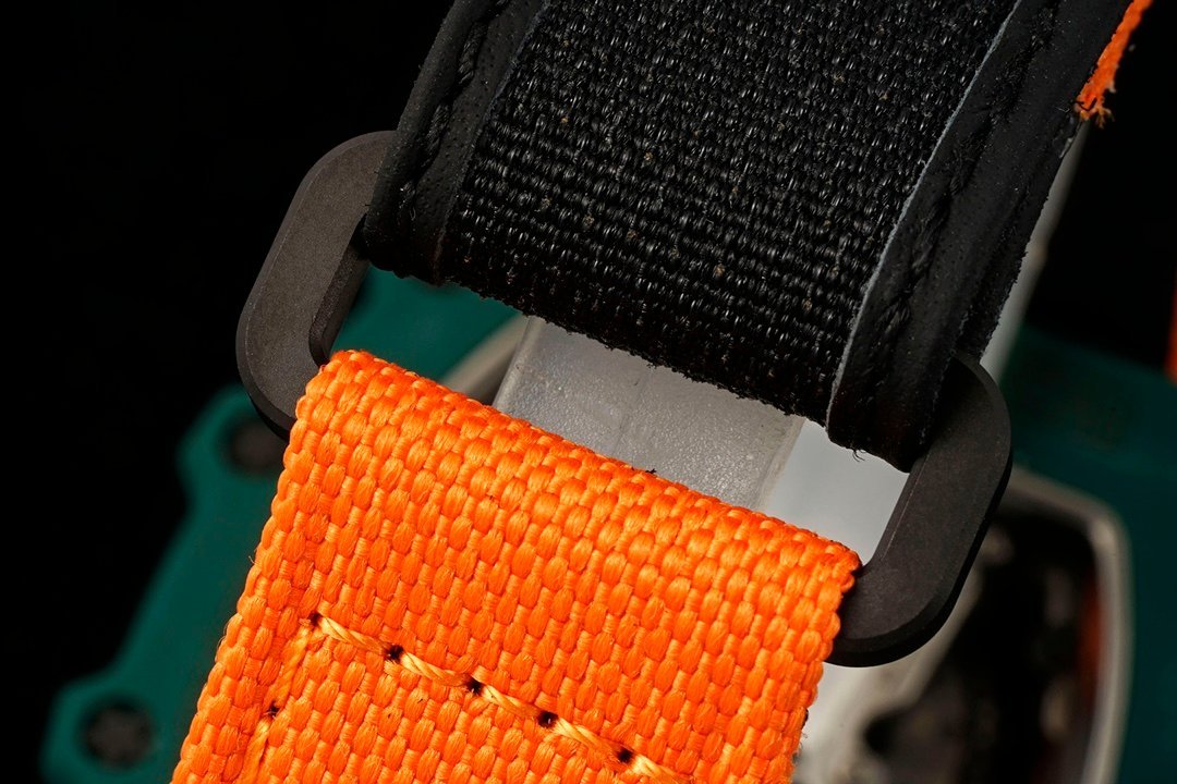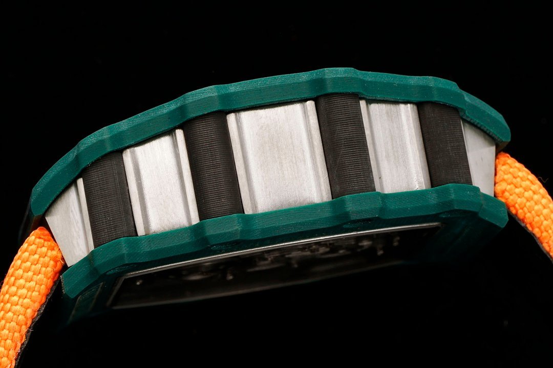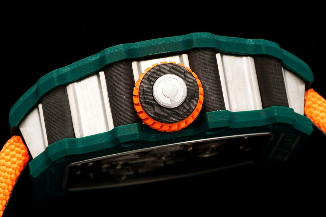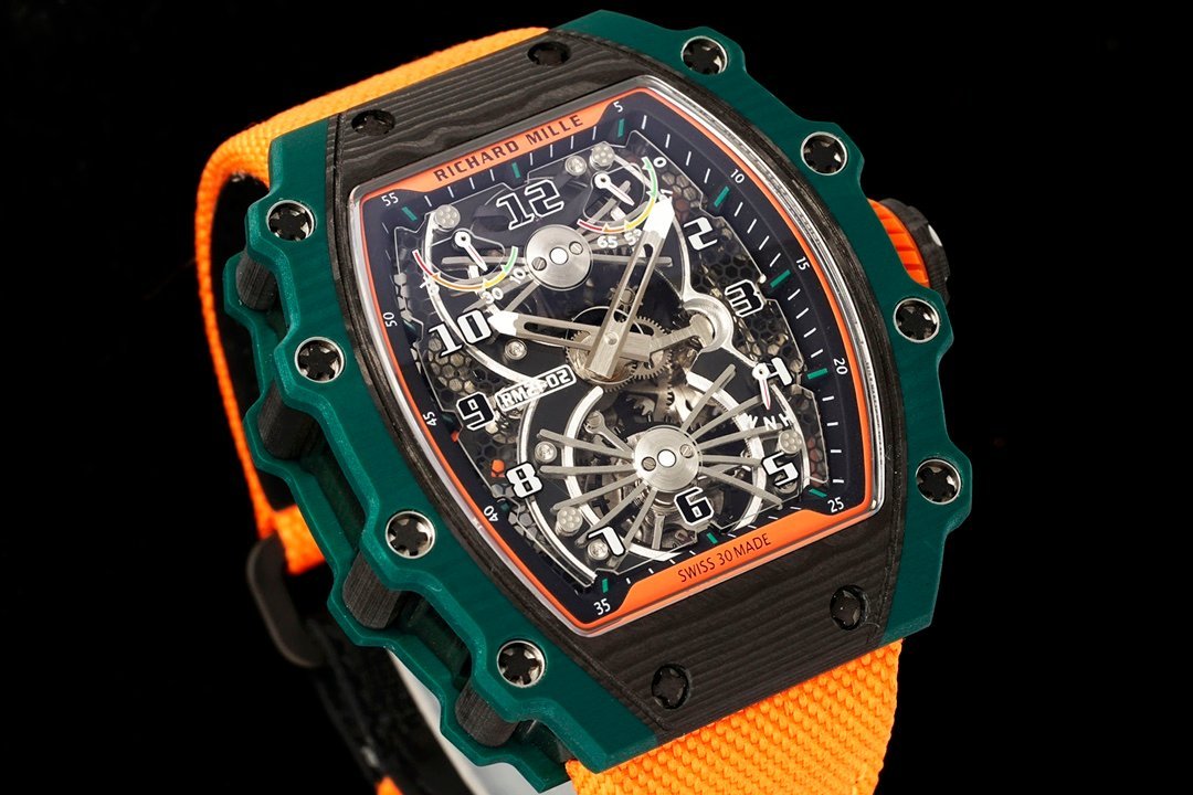 Introducing the RM 21-02 Tourbillon Aerodyne Replica Watch – a perfect blend of precision, style, and engineering. This 51mm x 17.5mm x 30mm timepiece features a stunning 3D dial with intricate samurai armor engraving, made from a high-strength, lightweight material. The dial offers a direct view of the Swiss-made movement’s baseplate, crafted from a high-stiffness, oxidation-resistant alloy with a laser-cut honeycomb structure for added durability and visual depth. The openworked hands are coated with luminescent paint, while the hour markers alternate in black and white, with the winding mechanism at 12 o’clock and the tourbillon at 6 o’clock resembling an engine’s blades. The Carbon TPT case and vibrant orange rubber strap complete the sporty look, while the sapphire glass ensures durability. With 50-meter water resistance and a solid bottom, this Swiss-made masterpiece is built for performance and style. A must-have for watch enthusiasts who appreciate precision engineering and aesthetics.