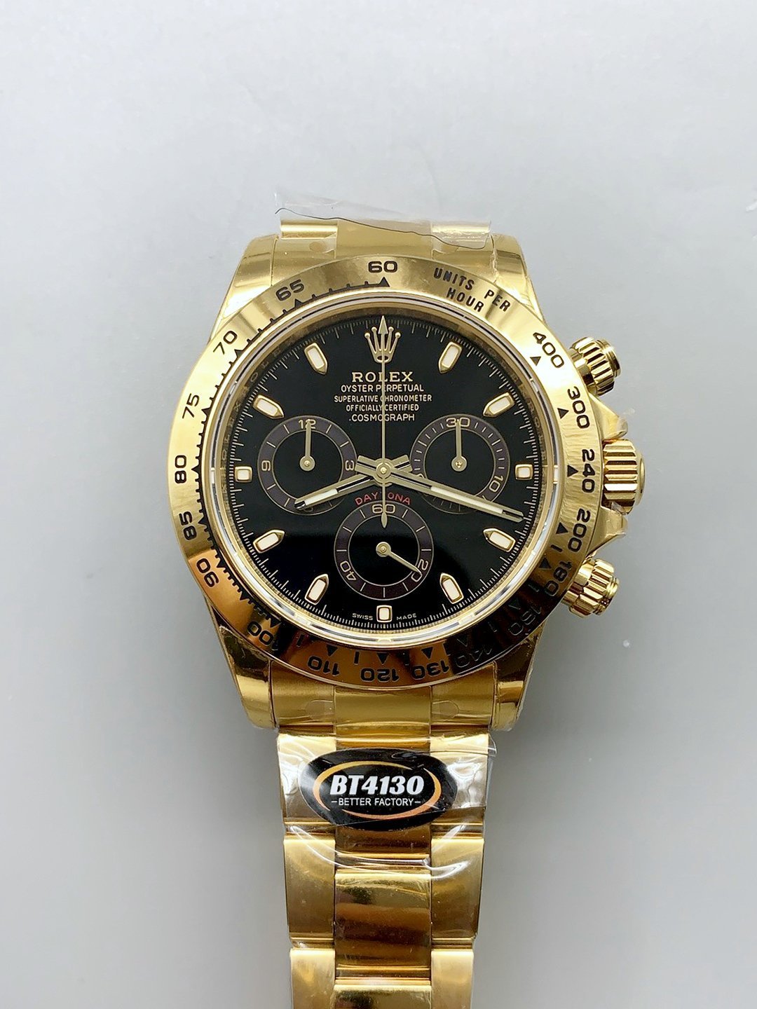 18K Yellow Gold Plating on 904 Solid Stainless Case with Rolex Markings and Engravings like the Authentic.The Best Rolex Daytona Model Replicated up to Date. The First Rolex model to adopt a 904L Steel on Casing and Strap which is the same steel used by Rolex. Compared with an Original Side by Side and there were NO Differences Whatsoever. Complete list of details have been stated below and you will see that tremendous amount of detaiing and work has been put into this edition.