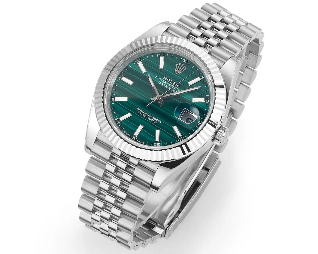Rolex Datejust 41 Custom Malachite Dial Green Watch — Premium 1:1 super clone. Case: 904L stainless steel case and bracelet. Crystal: Genuine sapphire crystal with AR coating. Movement: Clone Cal. 3235 (28,800 bph, 70hr power reserve). 12-month movement warranty. Free worldwide shipping on orders over $1,200.