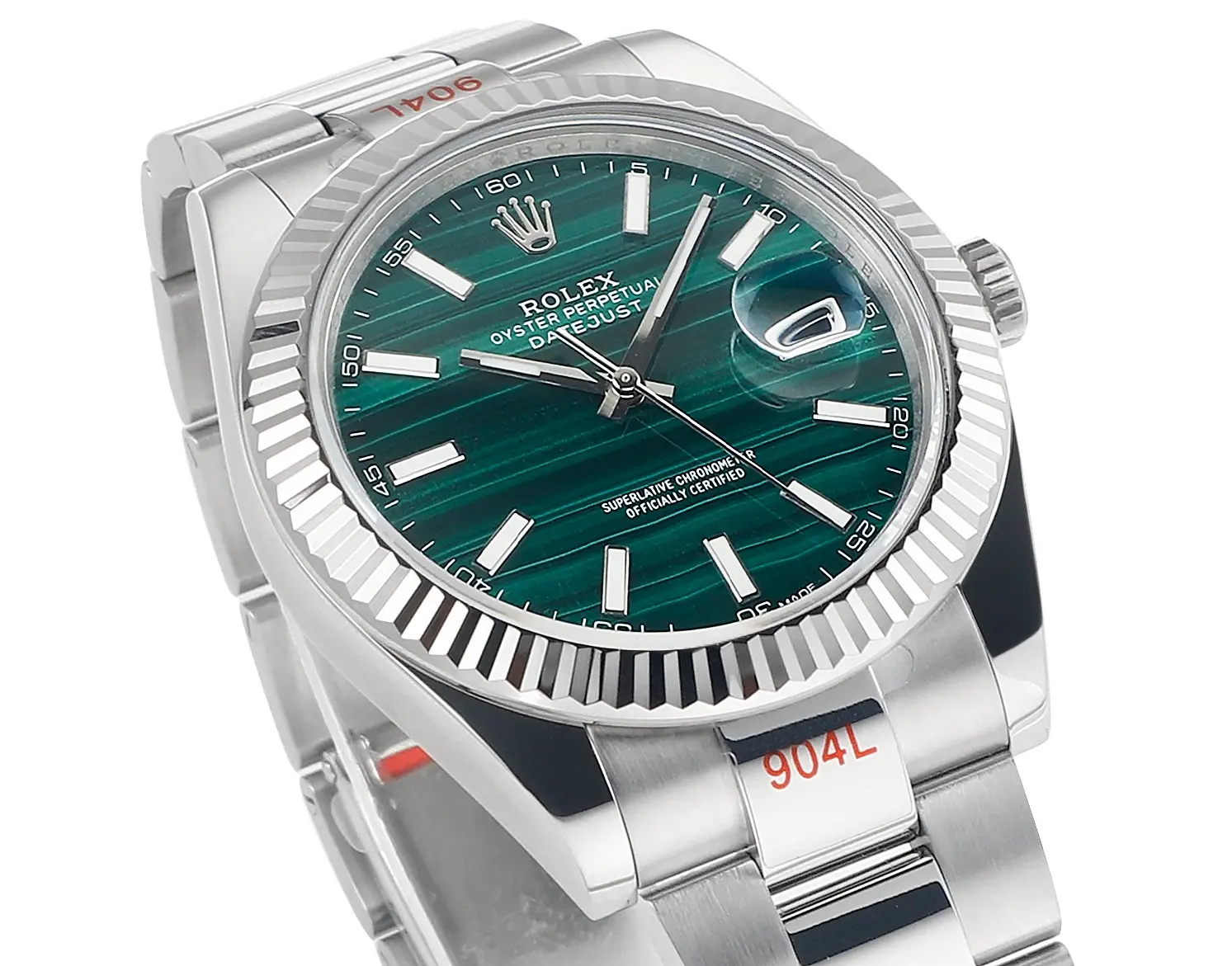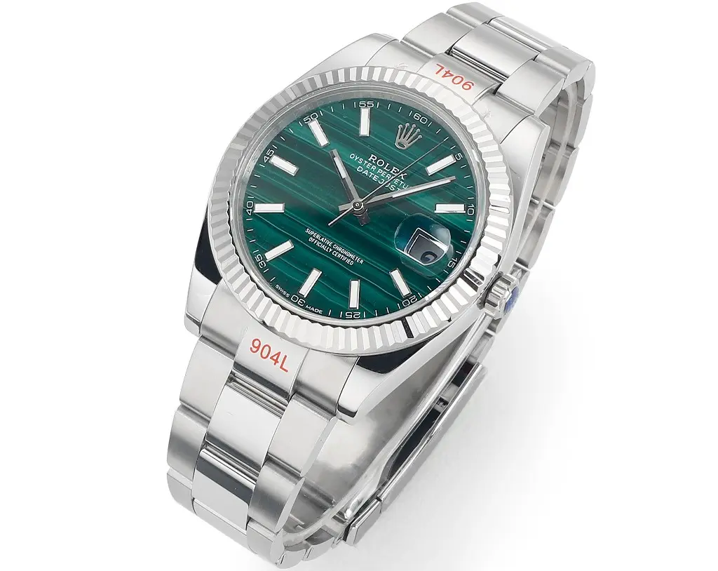 Rolex Datejust 41 Custom Malachite Dial — Premium 1:1 super clone. Case: 904L stainless steel case and bracelet. Crystal: Genuine sapphire crystal with AR coating. Movement: Clone Cal. 3235 (28,800 bph, 70hr power reserve). 12-month movement warranty. Free worldwide shipping on orders over $1,200.