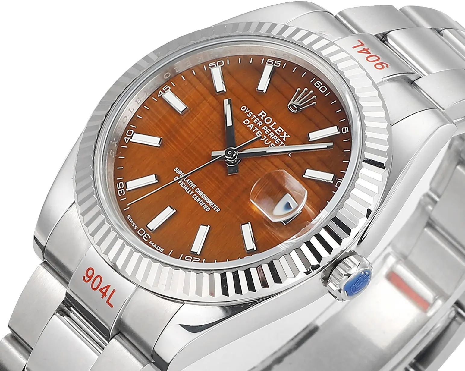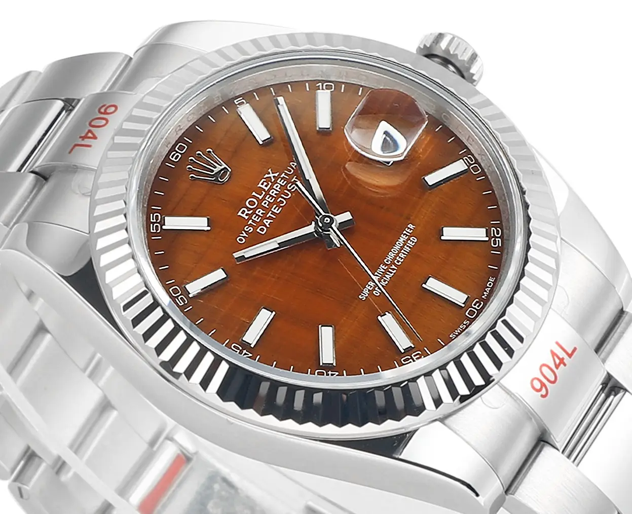 Rolex Datejust 41 Custom Tiger Eye Dial — Premium 1:1 super clone. Case: 904L stainless steel case and bracelet. Crystal: Genuine sapphire crystal with AR coating. Movement: Clone Cal. 3235 (28,800 bph, 70hr power reserve). 12-month movement warranty. Free worldwide shipping on orders over $1,200.
