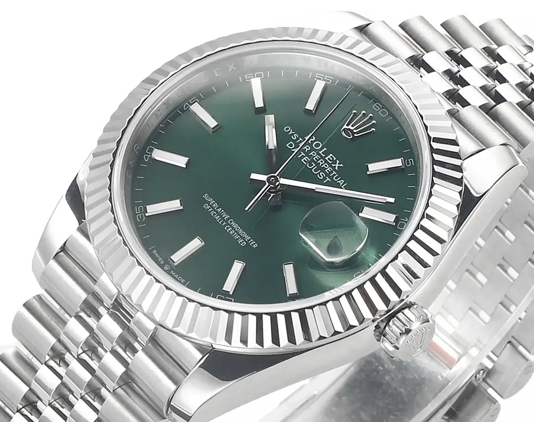 Rolex Datejust 41mm Green Dial Stainless Steel Jubilee Bracelet — Premium 1:1 super clone. Case: 904L stainless steel case and bracelet. Crystal: Genuine sapphire crystal with AR coating. Movement: Clone Cal. 3235 (28,800 bph, 70hr power reserve). 12-month movement warranty. Free worldwide shipping on orders over $1,200.