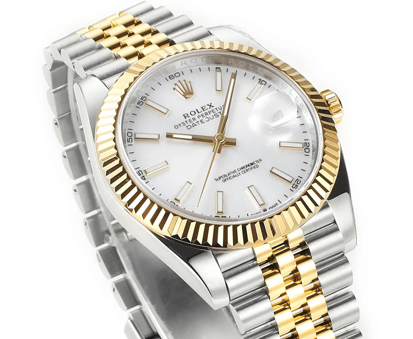 Rolex Datejust 41mm Two-Tone White Dial Fluted Bezel — Premium 1:1 super clone. Case: 904L stainless steel case and bracelet. Crystal: Genuine sapphire crystal with AR coating. Movement: Clone Cal. 3235 (28,800 bph, 70hr power reserve). 12-month movement warranty. Free worldwide shipping on orders over $1,200.