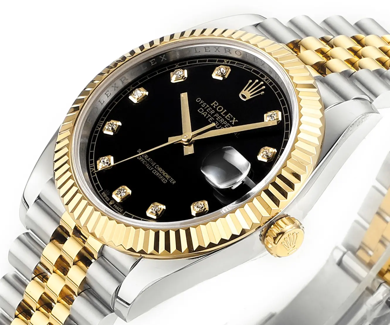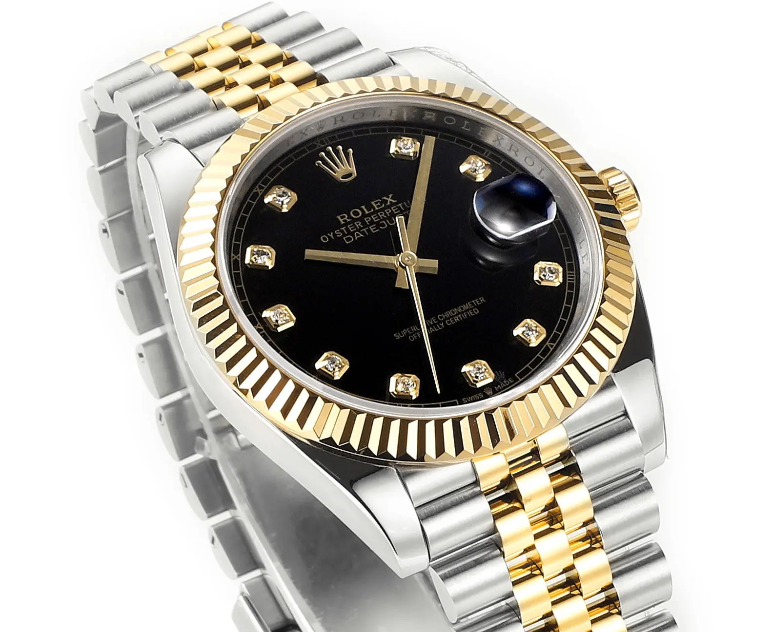 Rolex Datejust 41mm Watch – Two-Tone Steel and Gold with Black Diamond Dial — Premium 1:1 super clone. Case: 904L stainless steel case and bracelet. Crystal: Genuine sapphire crystal with AR coating. Movement: Clone Cal. 3235 (28,800 bph, 70hr power reserve). 12-month movement warranty. Free worldwide shipping on orders over $1,200.