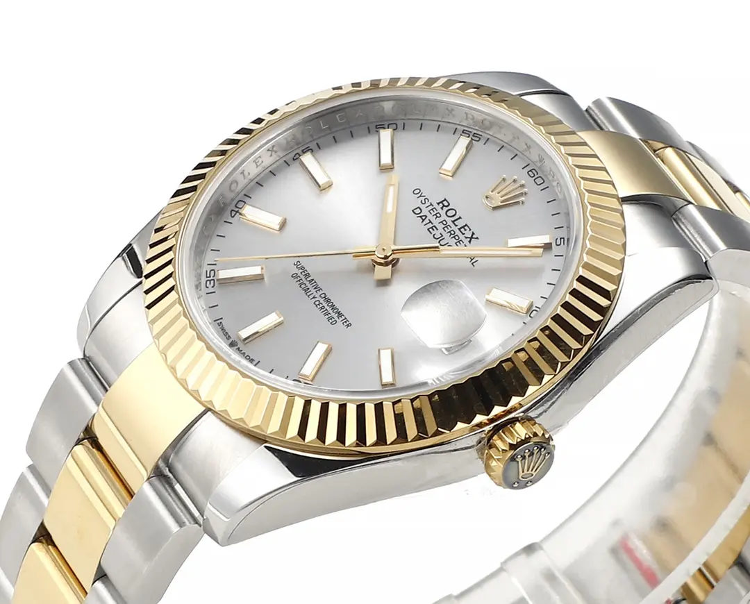 Rolex Datejust Two-Tone Silver Dial with 3235 Movement — Premium 1:1 super clone. Case: 904L stainless steel case and bracelet. Crystal: Genuine sapphire crystal with AR coating. Movement: Clone Cal. 3235 (28,800 bph, 70hr power reserve). 12-month movement warranty. Free worldwide shipping on orders over $1,200.