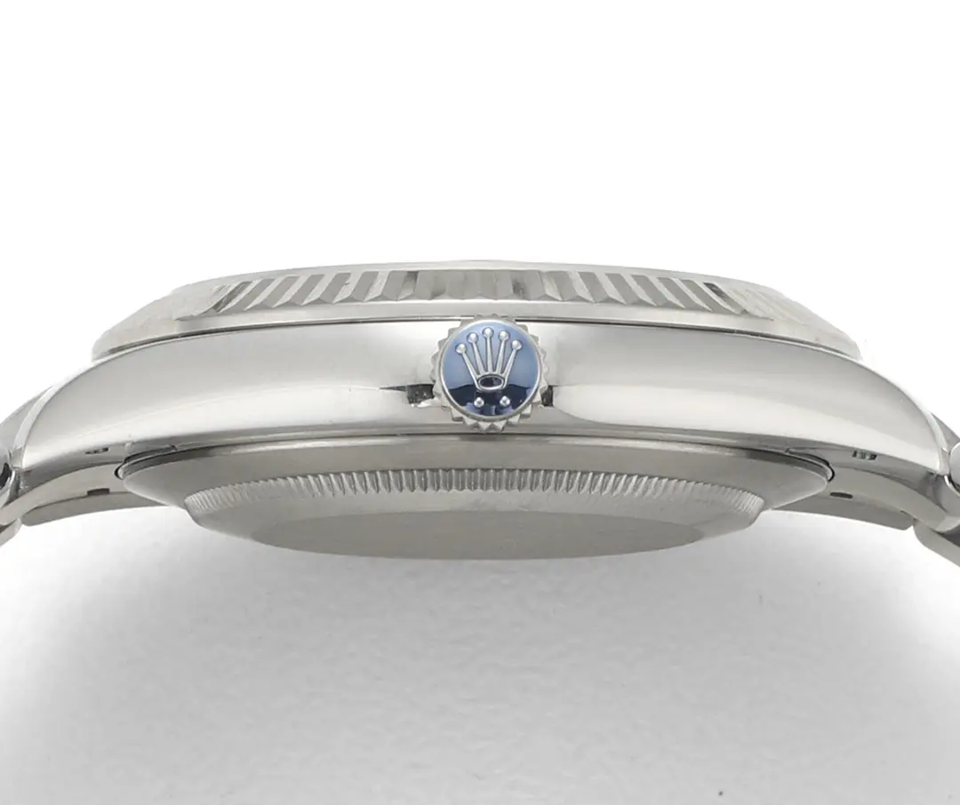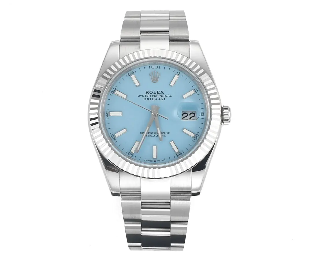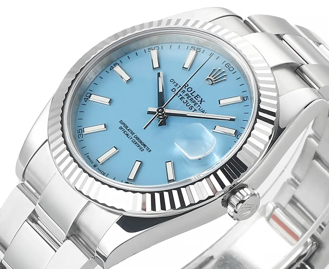 Rolex Datejust with 3235 Movement – Silver Stainless Steel, Ice Blue Dial, Fluted Bezel — Premium 1:1 super clone. Case: 904L stainless steel case and bracelet. Crystal: Genuine sapphire crystal with AR coating. Movement: Clone Cal. 3235 (28,800 bph, 70hr power reserve). 12-month movement warranty. Free worldwide shipping on orders over $1,200.