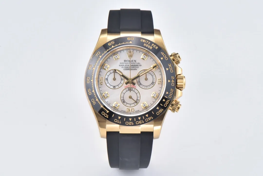Rolex Daytona 116518 Gold Engraved Natural Cloud Mother-of-Pearl Dial Watches with Black Rubber Strap — Premium 1:1 super clone. Case: 904L stainless steel case and bracelet. Crystal: Genuine sapphire crystal with AR coating. Movement: Clone Cal. 4130 (column-wheel flyback chronograph). 12-month movement warranty. Free worldwide shipping on orders over $1,200.