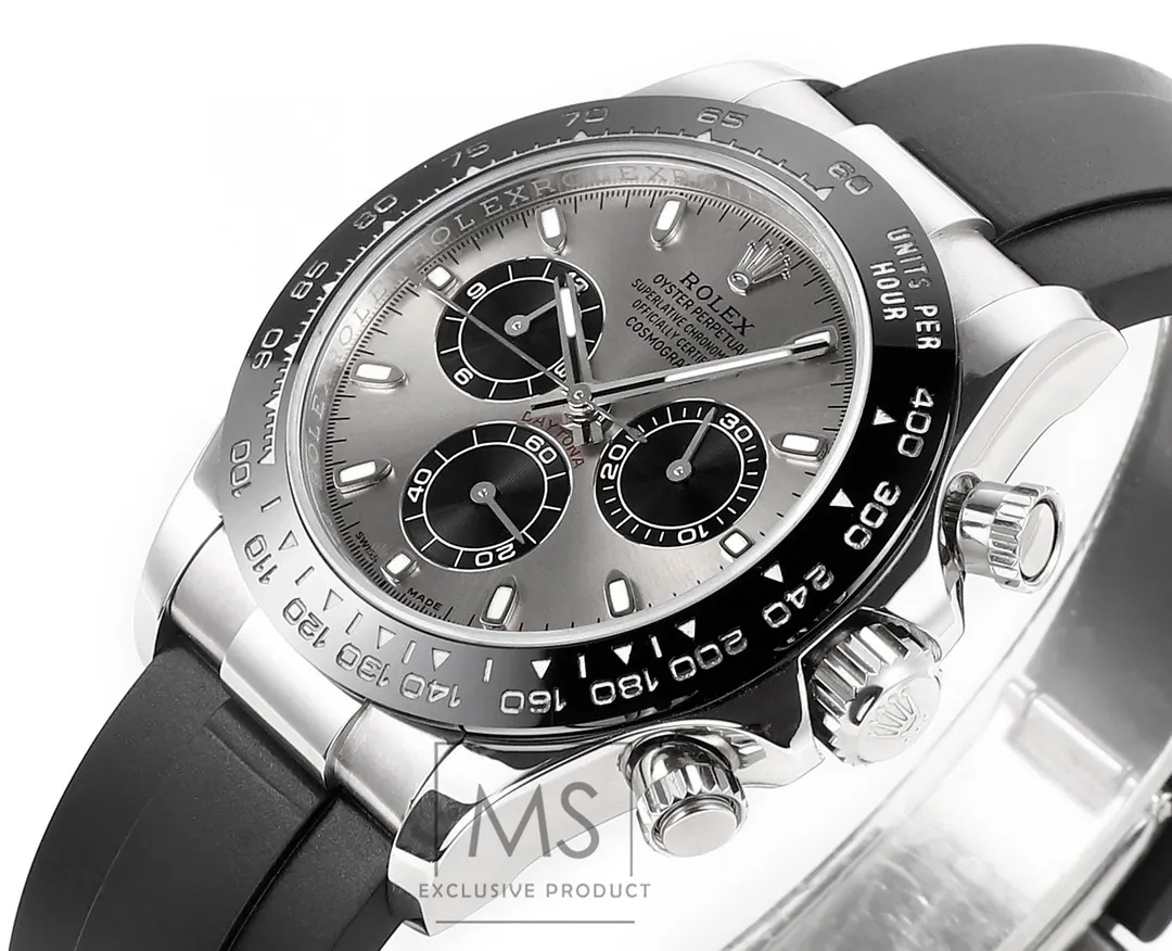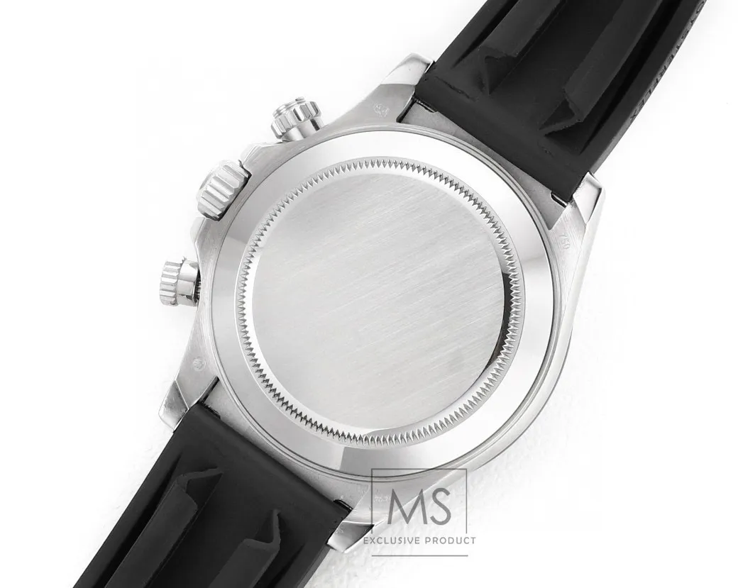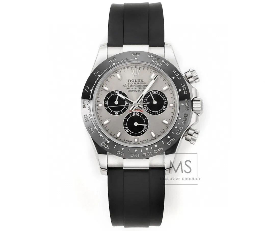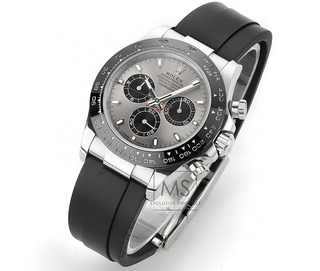 Rolex Daytona 4130 – Black Rubber Strap, Panda Dial, Ultra-Thin Case by Official Store — Premium 1:1 super clone. Case: 904L stainless steel case and bracelet. Crystal: Genuine sapphire crystal with AR coating. Movement: Clone Cal. 4130 (column-wheel flyback chronograph). 12-month movement warranty. Free worldwide shipping on orders over $1,200.