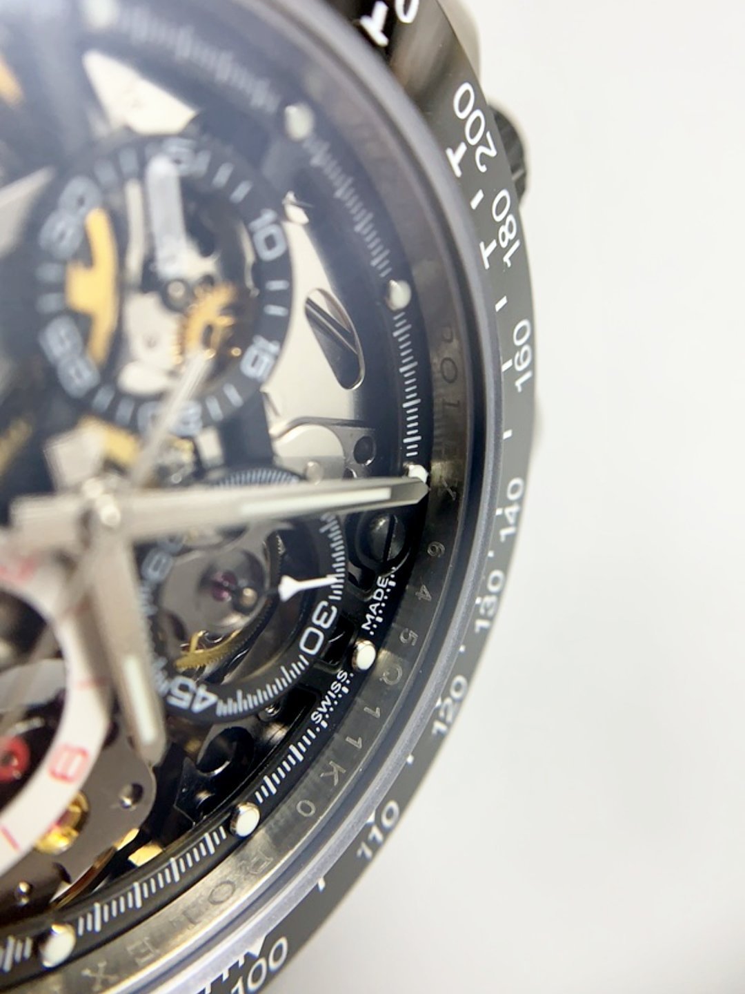 Skeleton with 3 Functional Sub Dials like the Authentic. White Scratch Proof Improved Markings Ceramic Bezel which has the same exact Fonts and Crisp marking as per the original