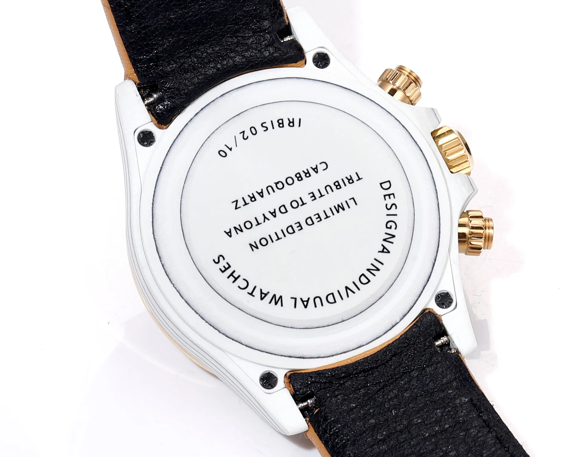 Rolex Daytona Carbon Fiber Custom Edition – Champagne Dial, Brown Strap, Enhanced Night Glow Case — Premium 1:1 super clone. Case: 904L stainless steel case and bracelet. Crystal: Genuine sapphire crystal with AR coating. Movement: Clone Cal. 4130 (column-wheel flyback chronograph). 12-month movement warranty. Free worldwide shipping on orders over $1,200.