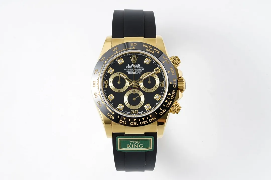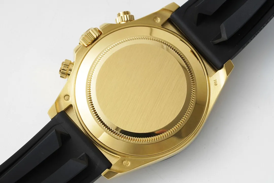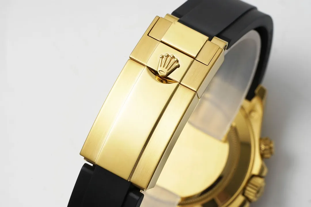 Rolex Daytona – Gold & Black Rubber Strap — Premium 1:1 super clone. Case: 904L stainless steel case and bracelet. Crystal: Genuine sapphire crystal with AR coating. Movement: Clone Cal. 4130 (column-wheel flyback chronograph). 12-month movement warranty. Free worldwide shipping on orders over $1,200.