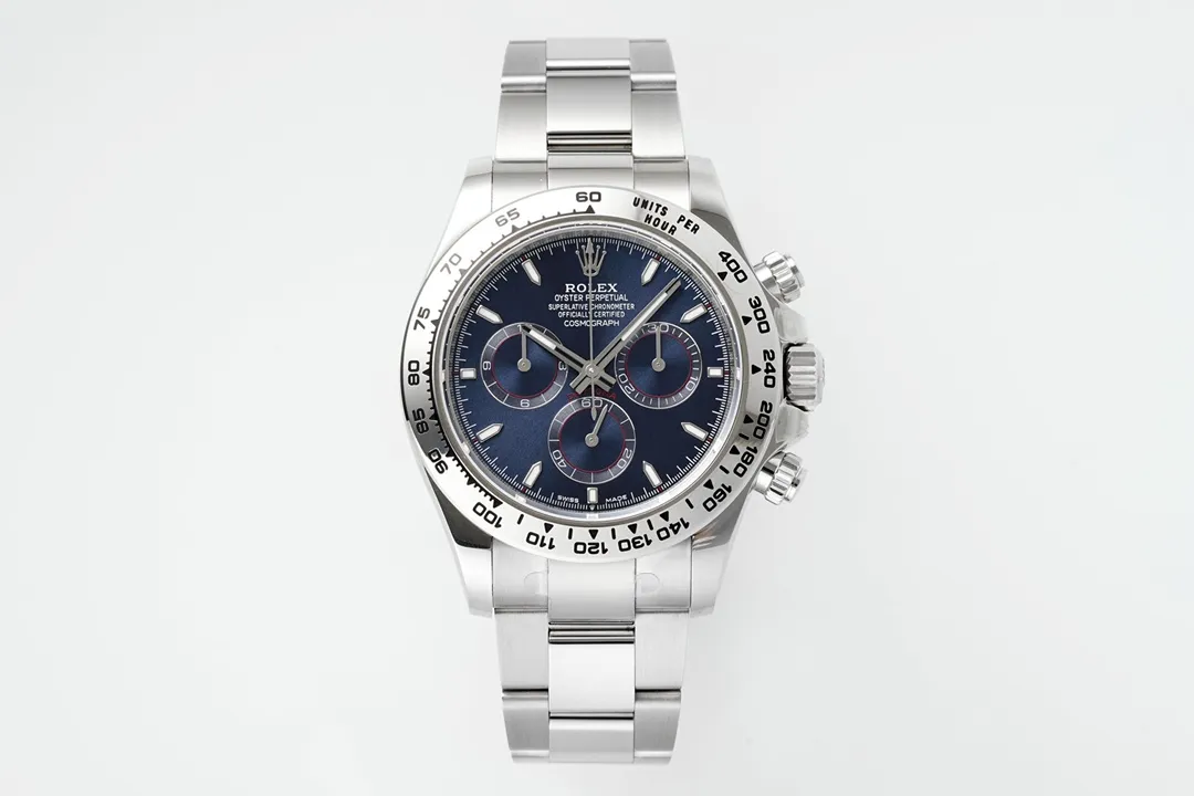Rolex Daytona Platinum Watch with Blue Dial – Limited Stock -Exclusive — Premium 1:1 super clone. Case: 904L stainless steel case and bracelet. Crystal: Genuine sapphire crystal with AR coating. Movement: Clone Cal. 4130 (column-wheel flyback chronograph). 12-month movement warranty. Free worldwide shipping on orders over $1,200.