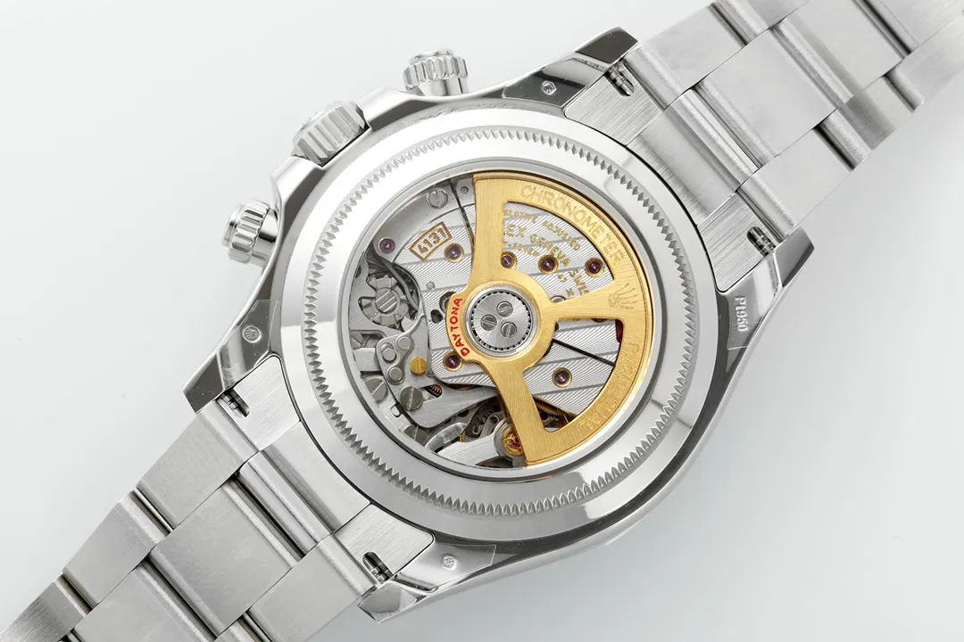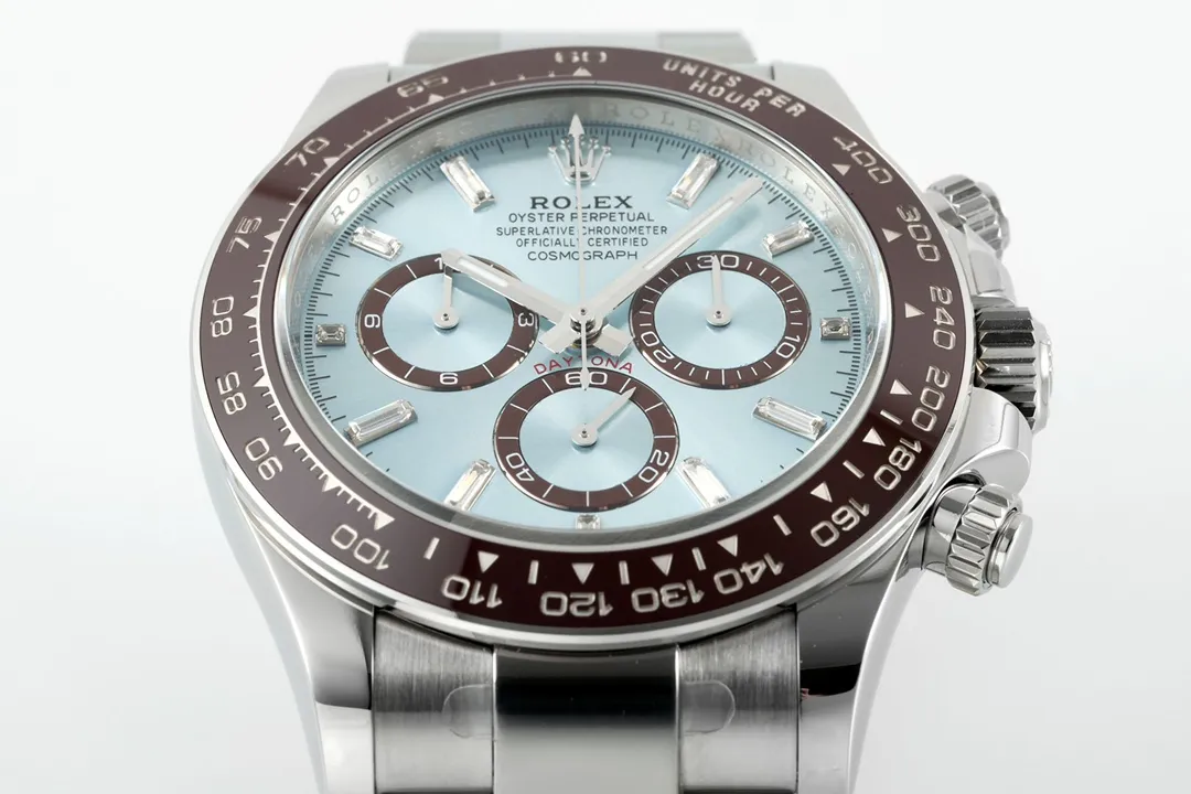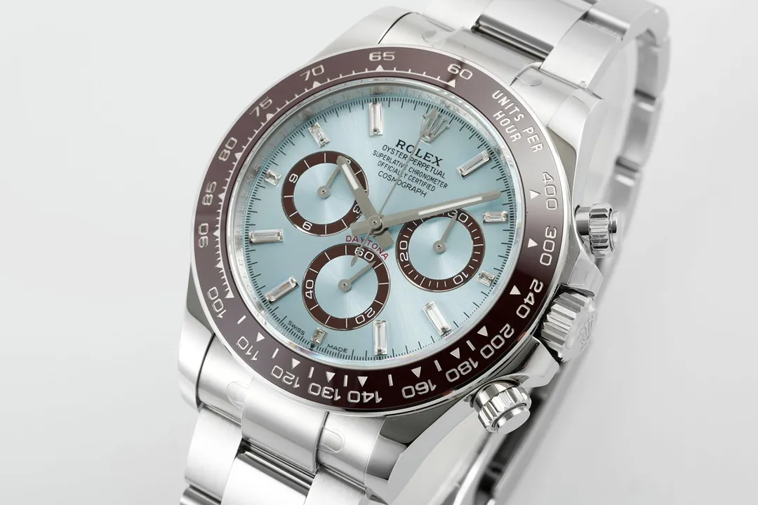 Rolex Daytona – Silver Stainless Steel, Blue Dial, Premium Chronograph — Premium 1:1 super clone. Case: 904L stainless steel case and bracelet. Crystal: Genuine sapphire crystal with AR coating. Movement: Clone Cal. 4130 (column-wheel flyback chronograph). 12-month movement warranty. Free worldwide shipping on orders over $1,200.