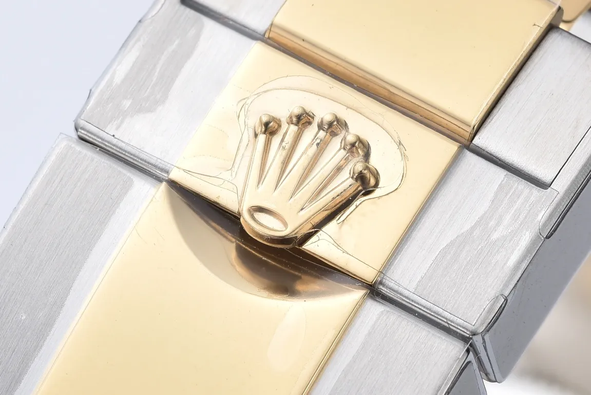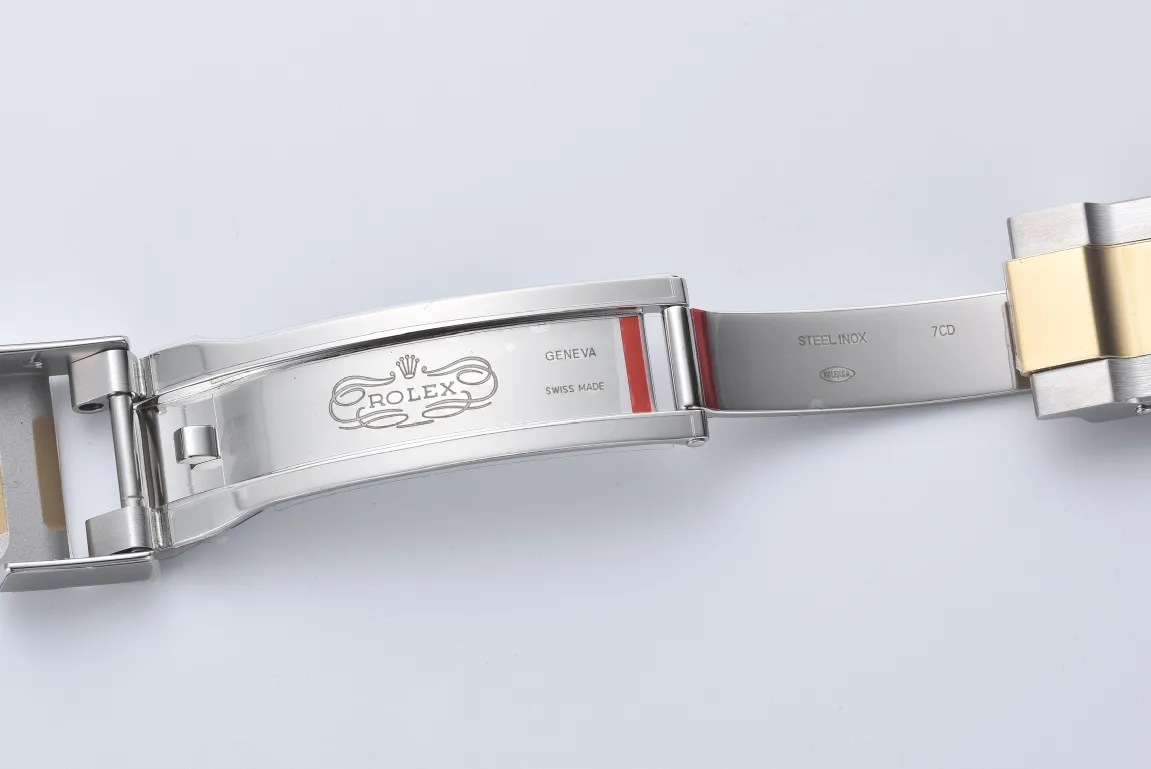 Rolex Daytona Two-Tone Champagne Dial Engraved — Premium 1:1 super clone. Case: 904L stainless steel case and bracelet. Crystal: Genuine sapphire crystal with AR coating. Movement: Clone Cal. 4130 (column-wheel flyback chronograph). 12-month movement warranty. Free worldwide shipping on orders over $1,200.