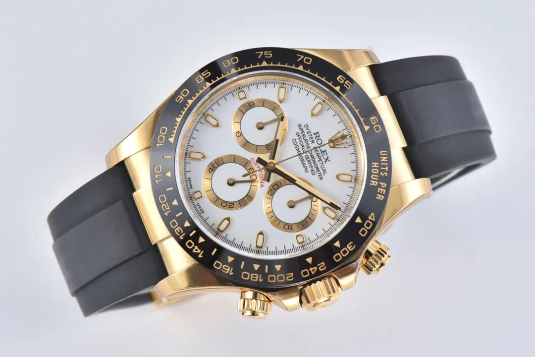The Daytona 116518 watch features a gold-plated body with an ivory-white dial and a black ceramic bezel. The timepiece is a combination of elegance and high-quality materials that will never go out of style.