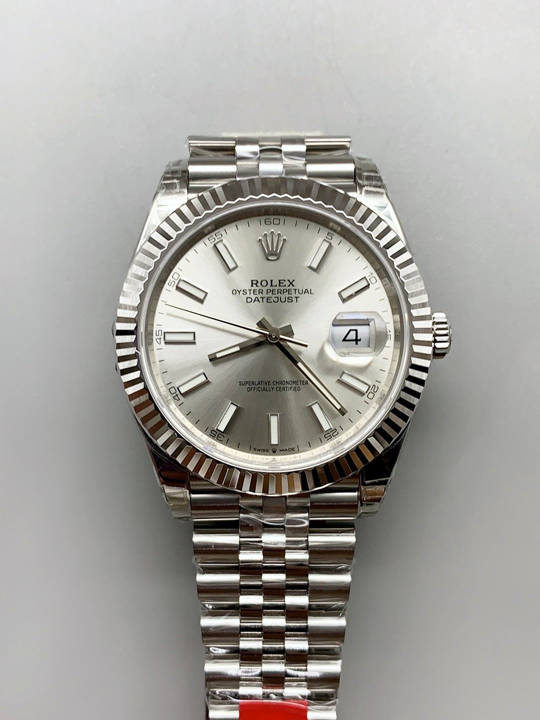 AR Factory Rolex Datejust series m126334-0004 1:1 top-grade replica watch, silver-gray dial, 3235 movement. Features a 904L stainless steel case, 41mm diameter, and a 300-meter water-resistant rotating bezel. The dial is silver-gray with gold Arabic numeral hour markers, and a date display window at the 6 o’clock position. Powered by a Cal. 3235 movement with a 72-hour power reserve.