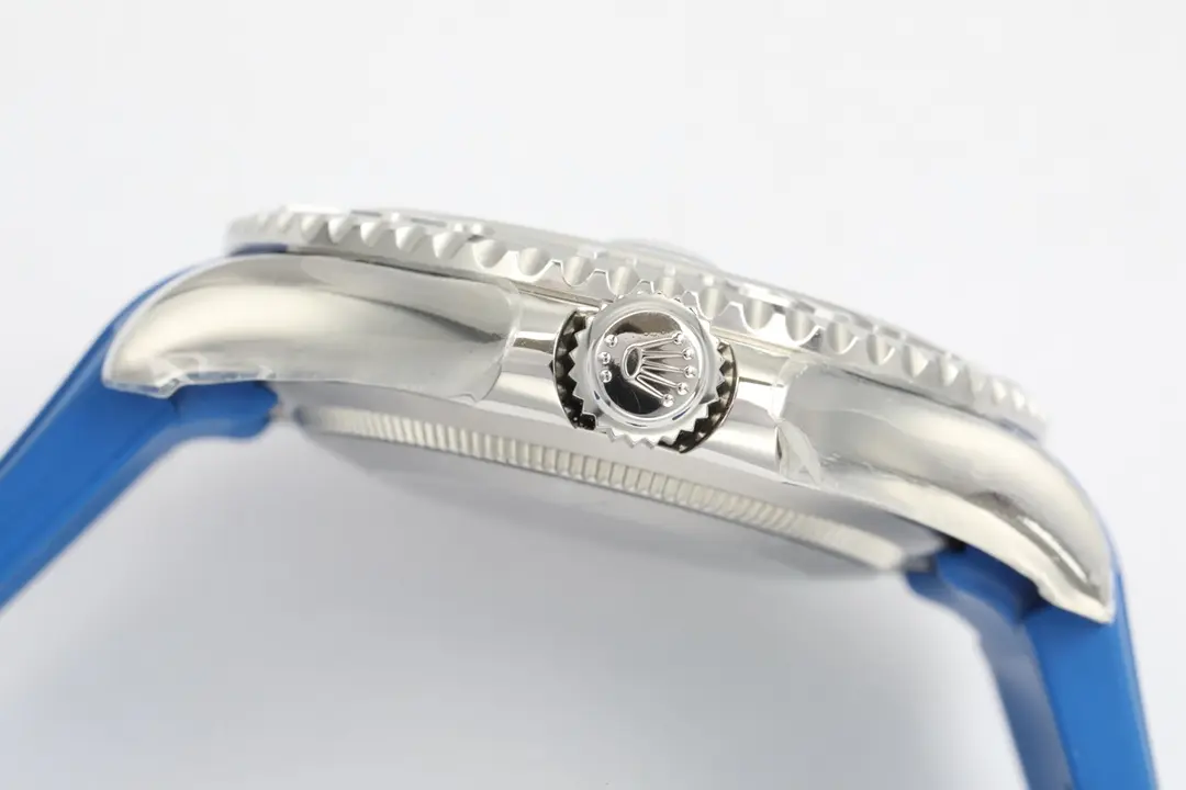Rolex Yacht-Master 42 Blue Dial Stainless Steel Case with Blue Rubber Strap — Premium 1:1 super clone. Case: 904L stainless steel case and bracelet. Crystal: Genuine sapphire crystal with AR coating. Movement: Clone Rolex caliber (28,800 bph automatic). 12-month movement warranty. Free worldwide shipping on orders over $1,200.