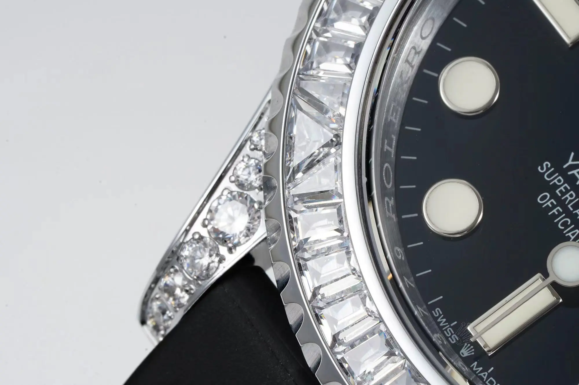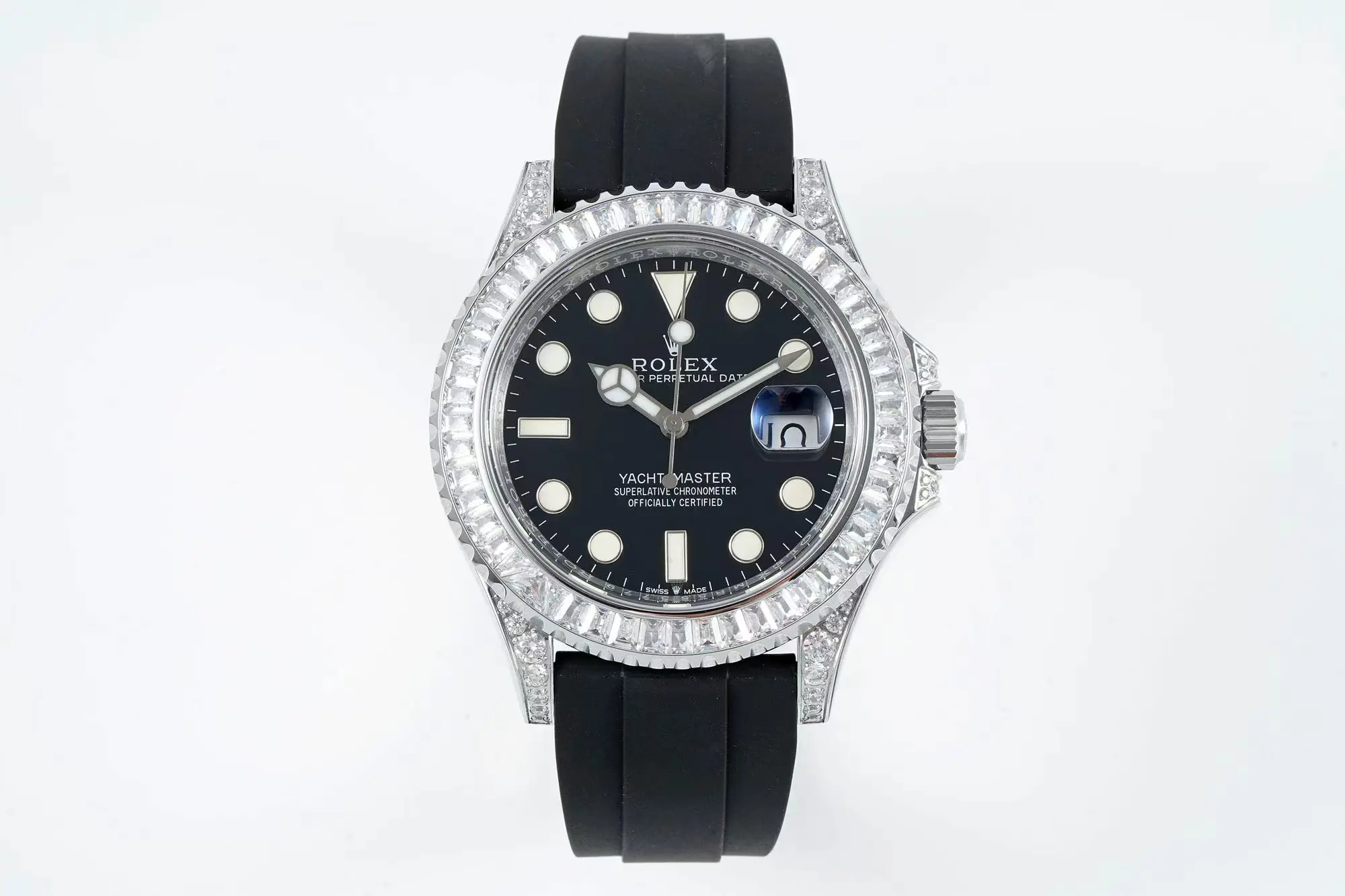 Rolex Yacht-Master 42mm Black Dial Diamond Bezel Rubber Strap Watch — Premium 1:1 super clone. Case: 904L stainless steel case and bracelet. Crystal: Genuine sapphire crystal with AR coating. Movement: Clone Rolex caliber (28,800 bph automatic). 12-month movement warranty. Free worldwide shipping on orders over $1,200.