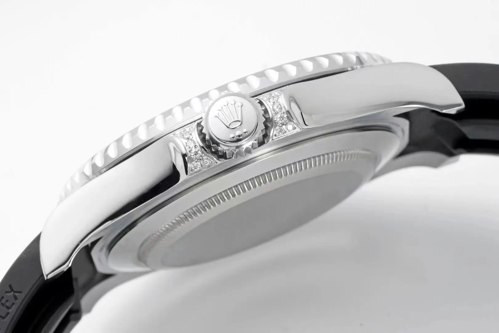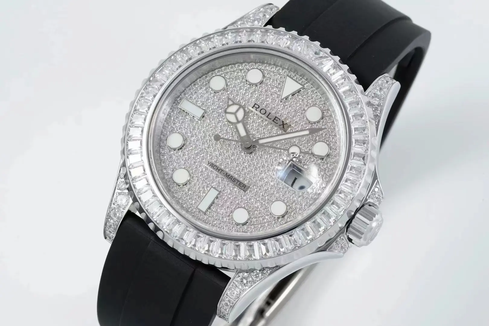 Rolex Yacht-Master 42mm Diamond Set Watch – Silver Dial with Black Rubber Strap — Premium 1:1 super clone. Case: 904L stainless steel case and bracelet. Crystal: Genuine sapphire crystal with AR coating. Movement: Clone Rolex caliber (28,800 bph automatic). 12-month movement warranty. Free worldwide shipping on orders over $1,200.