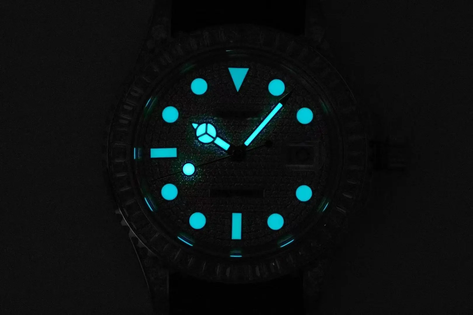 - Strap: Black Rubber Strap — vulcanized rubber with correct shore hardness and signed tang/deployment buckle.