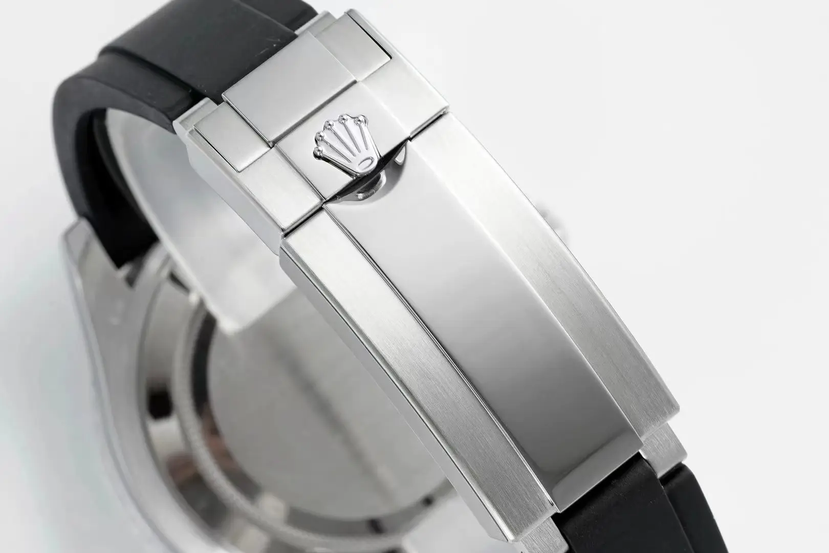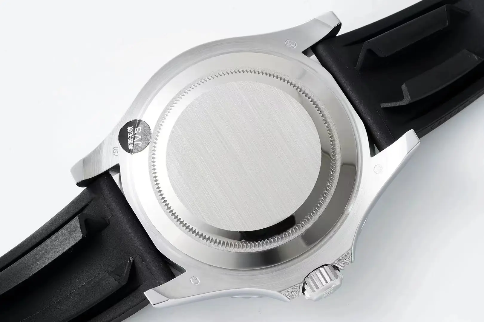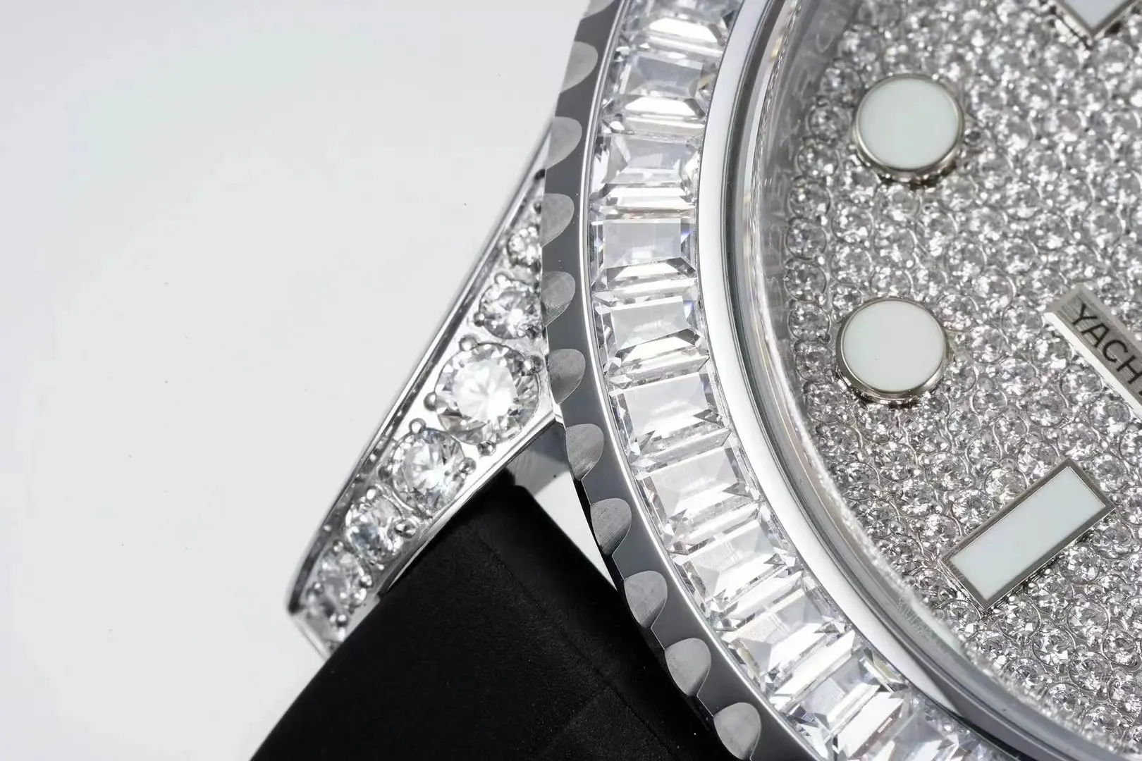 Diamond Bezel: The bezel of this watch is adorned with a stunning array of diamonds. This watch adds an air of elegance and luxury. Silver Dial A silver dial adds sophistication and improves readability. This gives the watch a classic look. Black Rubber Strap This black rubber strap is comfortable and durable, making it ideal for active or casual wear. The watch has a large case size and looks bold. This style, which is both fashionable and functional for maritime trips as well as formal occasions, will be perfect at any event. The Rolex Yacht Master features a black band with a silver dial. The watch embodies the perfect blend of practicality and luxury, much like a high-quality.