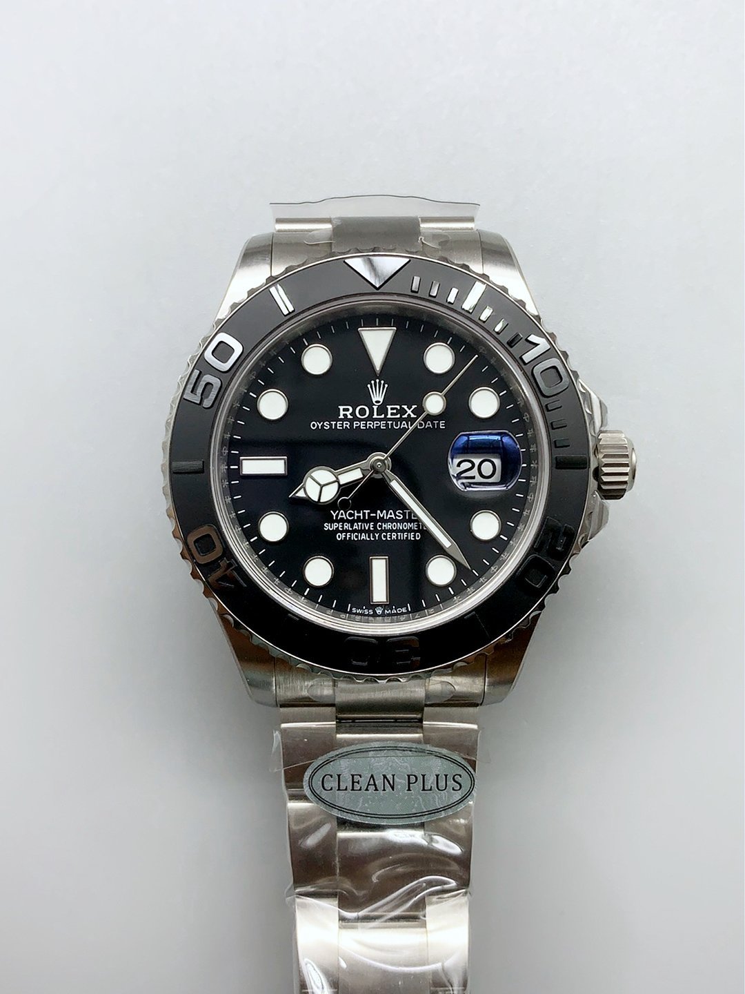 The Rolex Yacht-Master 226627 watch is a classic replica from the Clean Plus factory. It features a lightweight titanium 42mm case paired with a deep black dial, combining sporty and elegant aesthetics.