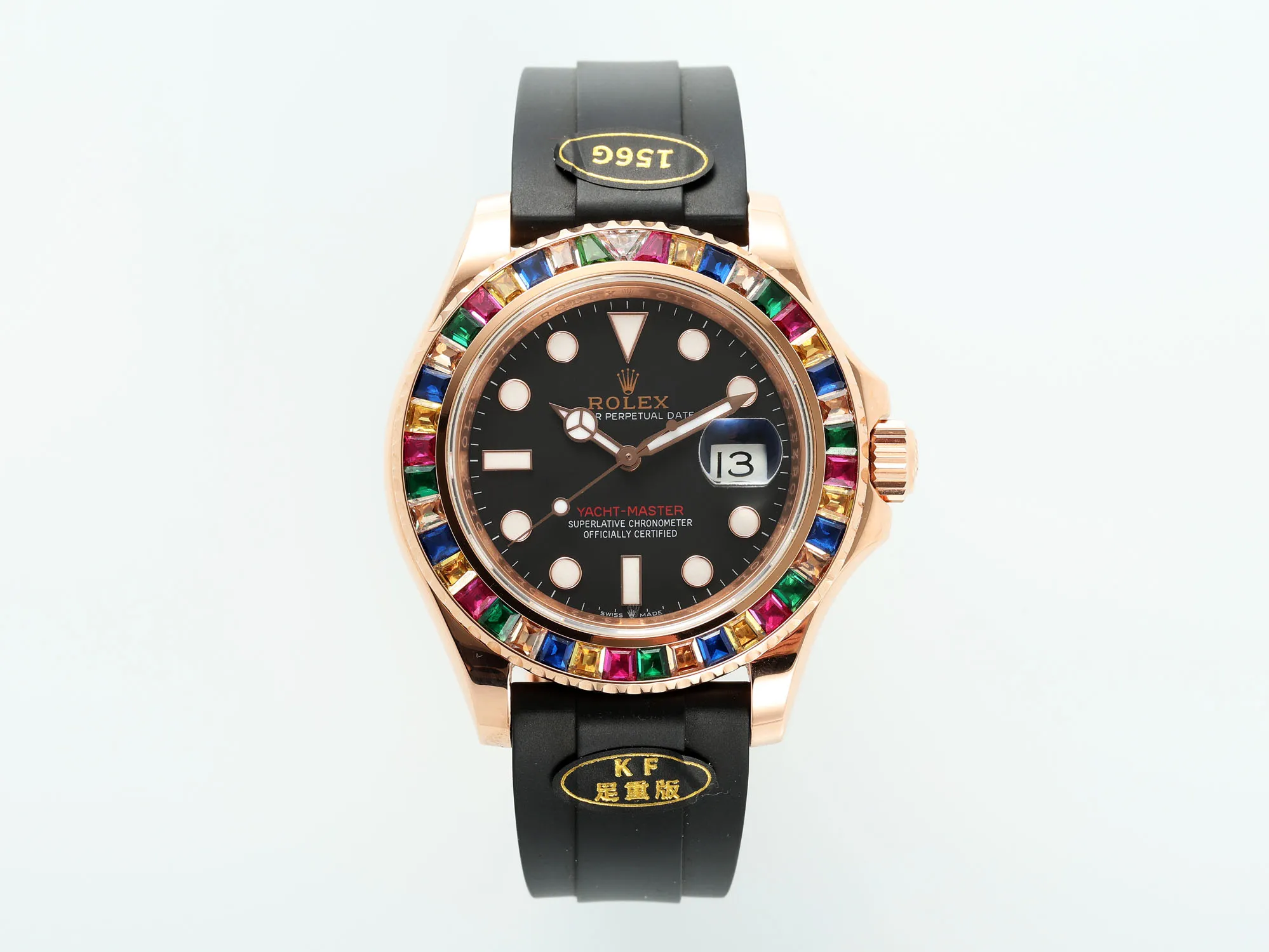 The KF Rolex Yacht Master M126655 features a rose-gold case with a gem-set bezel and contrasting black rubber strap. The Cal.3235 and innovative materials ensure style and quality.