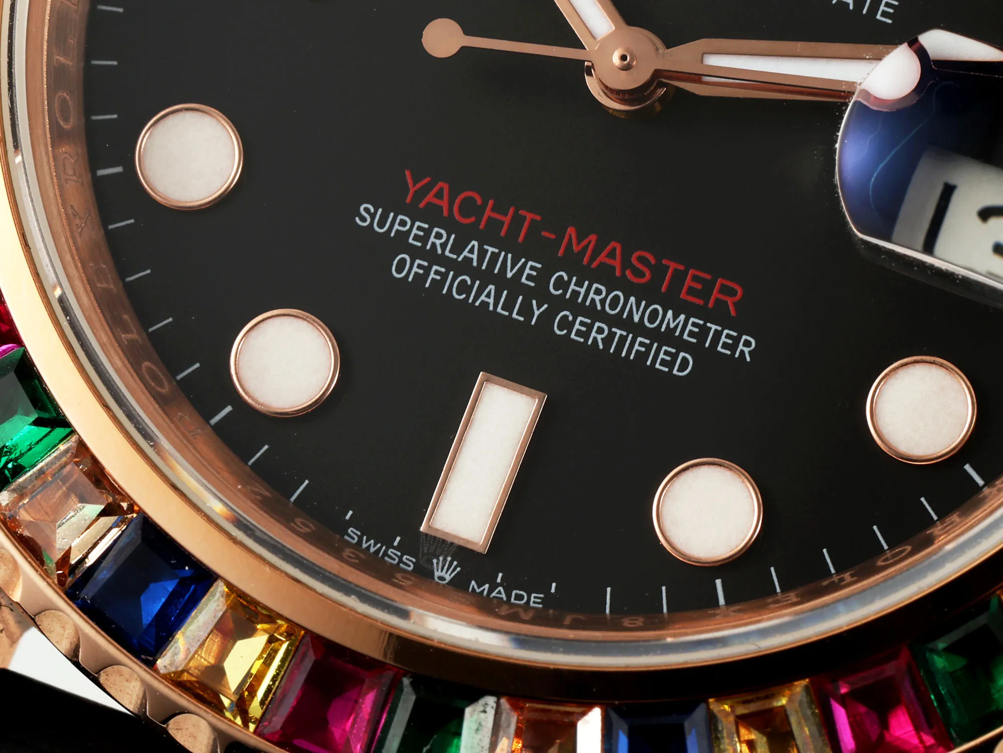 - Gem-Set bezel: This stunning bezel is adorned with vibrant gemstones. It adds a special and unique touch to Yacht-Master’s classic design.