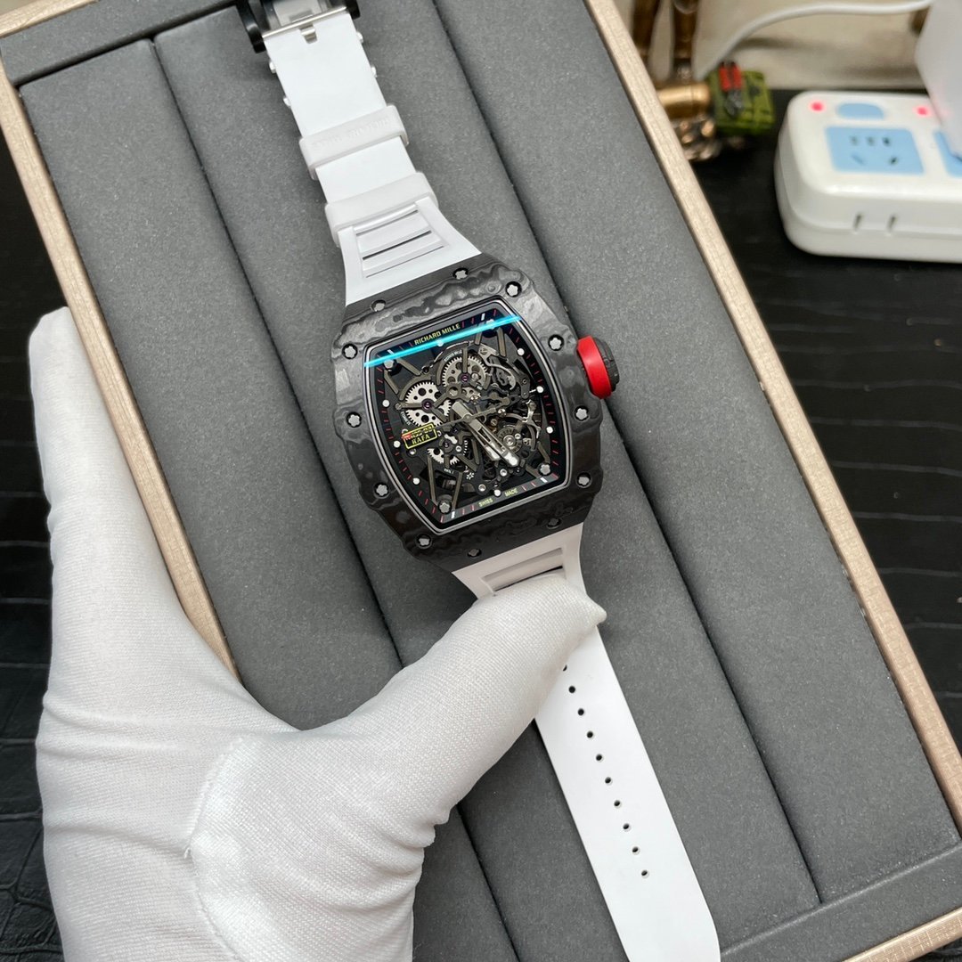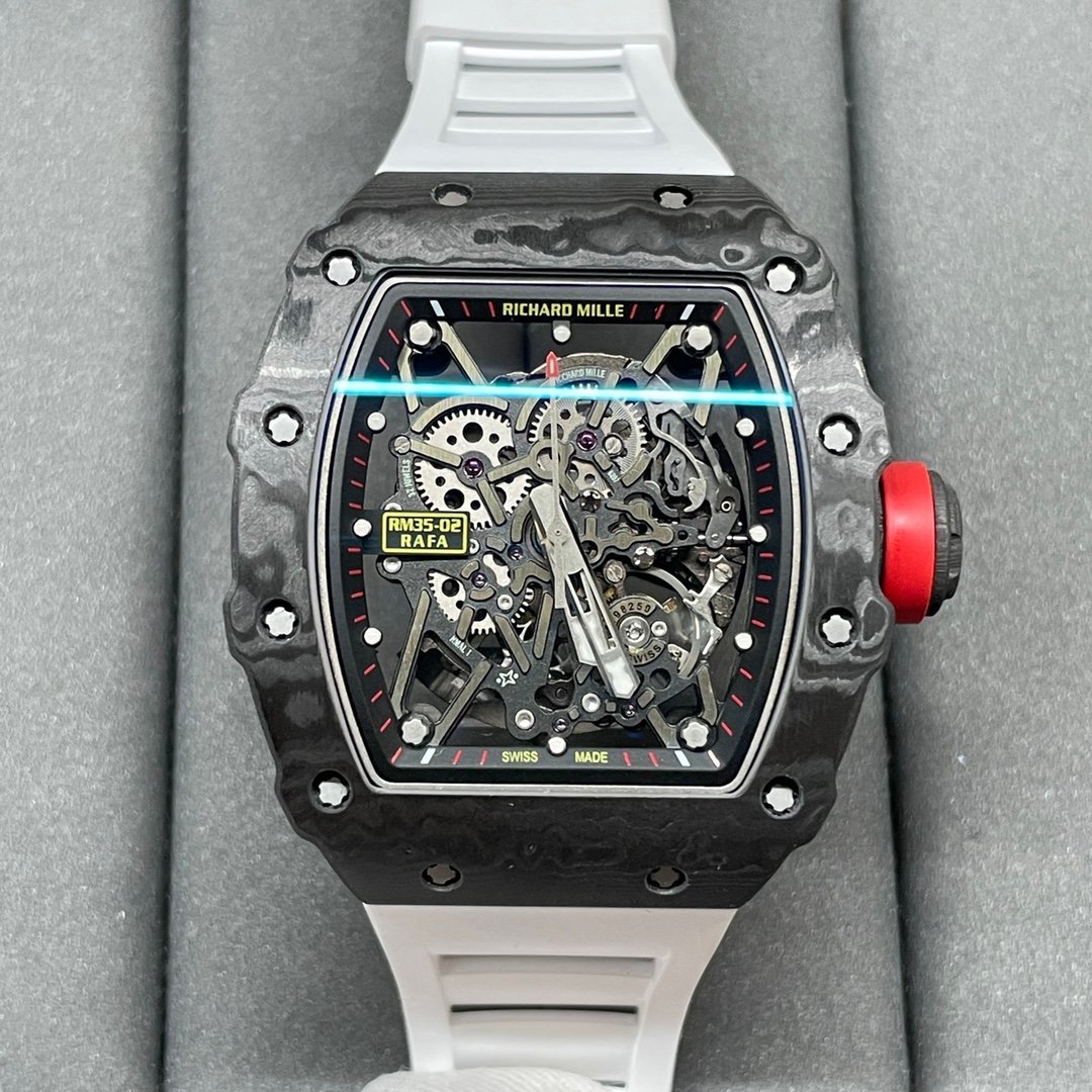 RM 35-02 RAFA replica with white rubber strap, skeletonized dial and Nadal-inspired performance styling.
