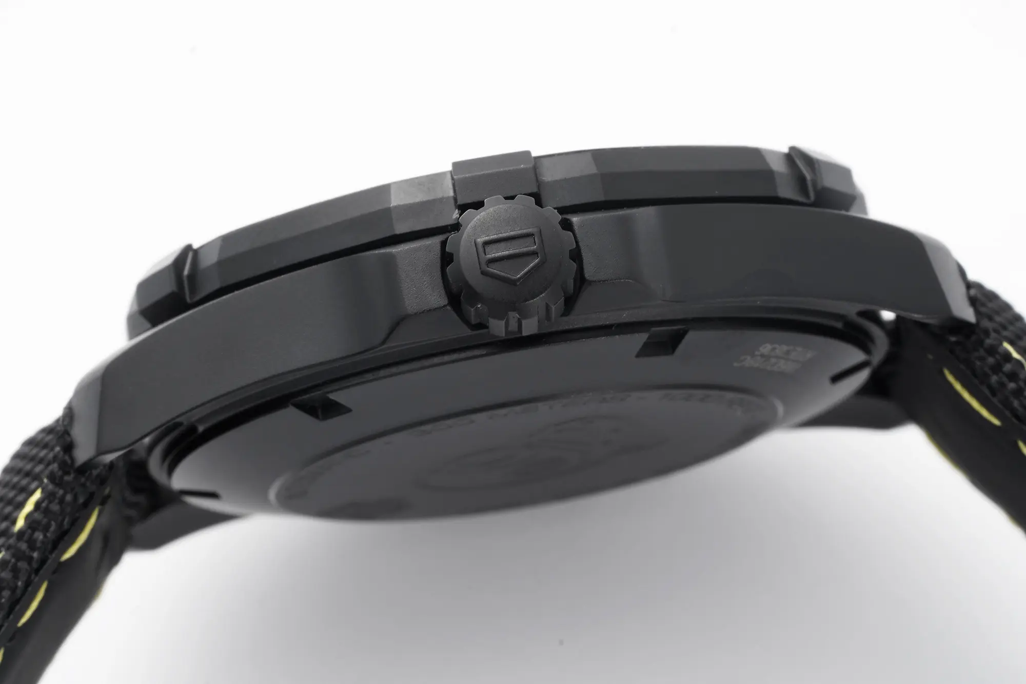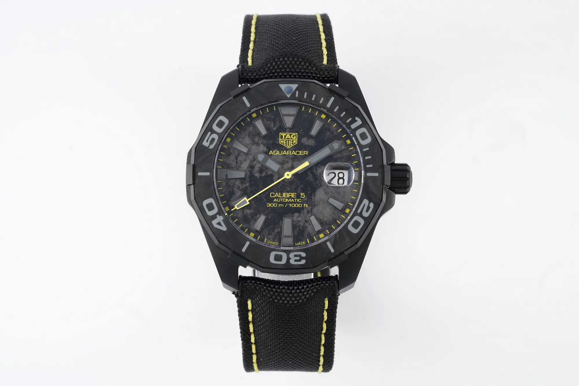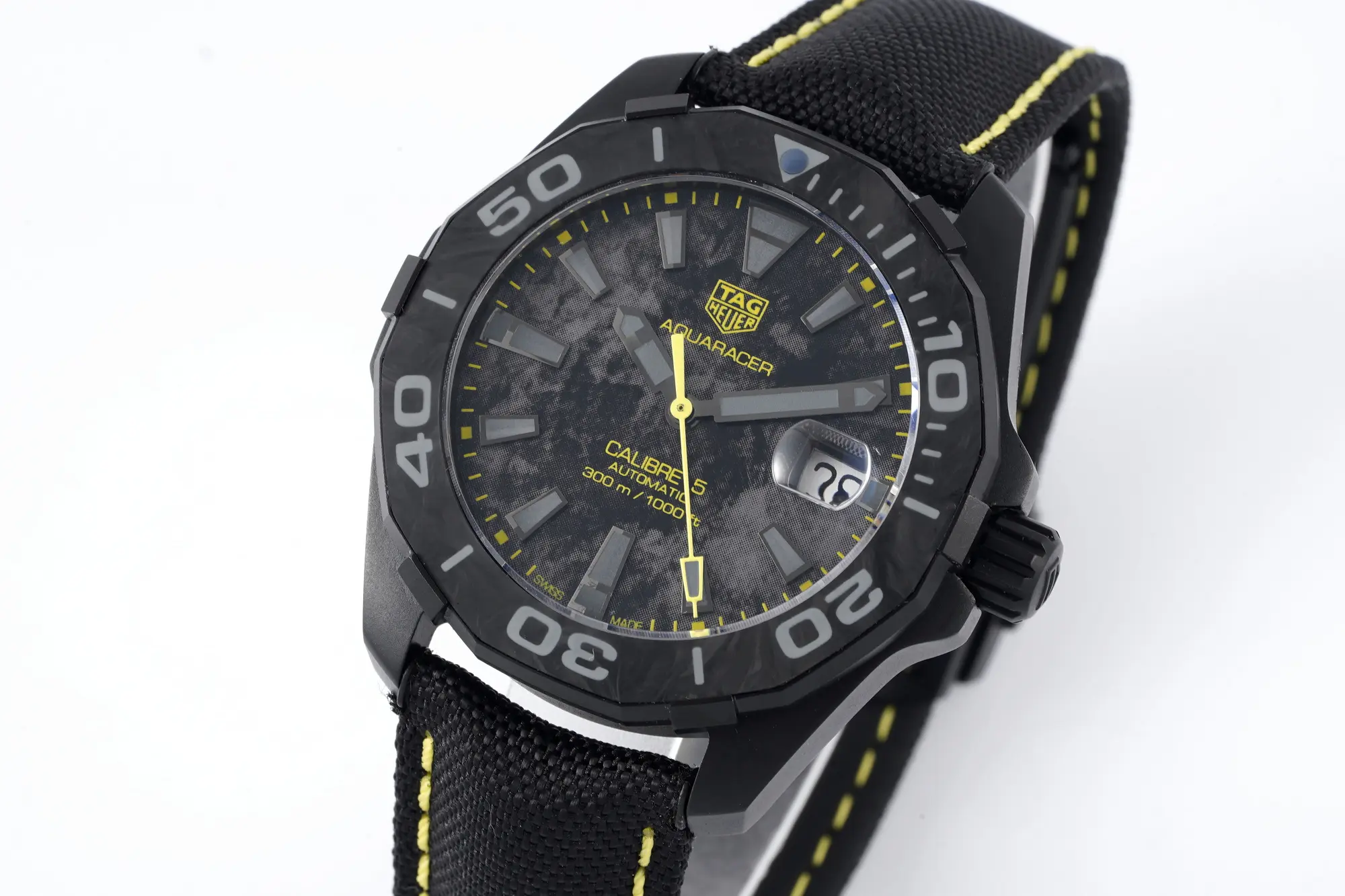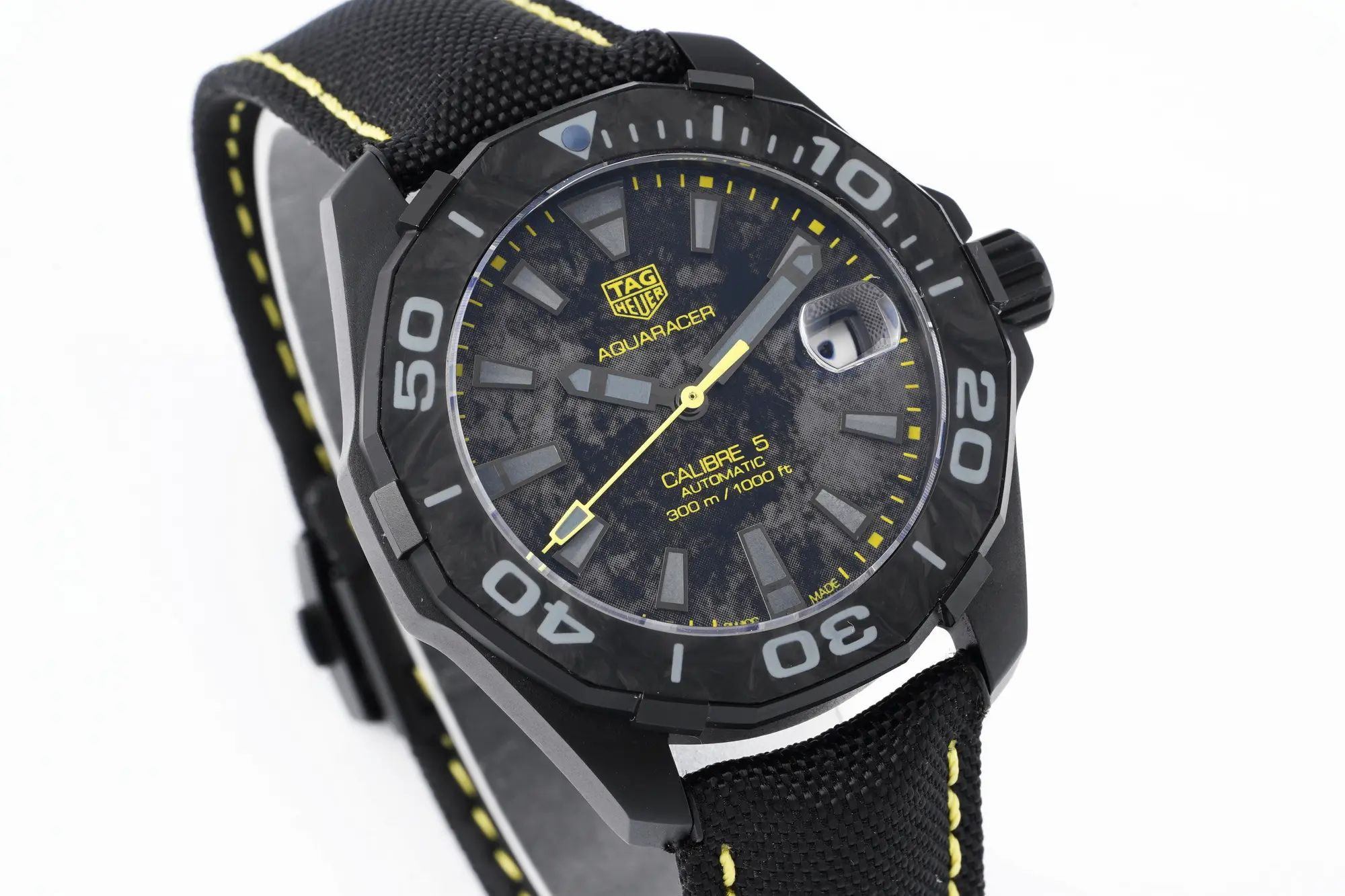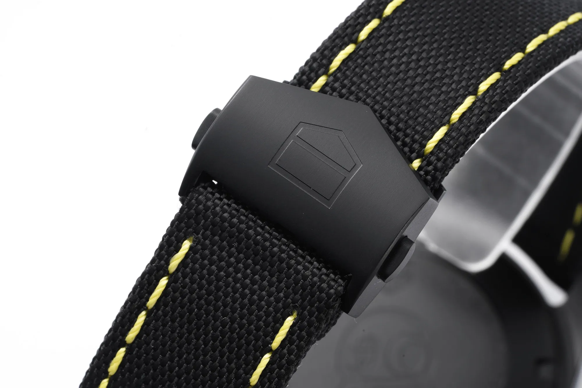 TAG Heuer – Black Carbon Fiber Dial, Yellow Stitching Strap, Formal & Casual Style, SW200 Movement — Premium 1:1 super clone. Case: 316L stainless steel case and bracelet. Crystal: Genuine sapphire crystal with AR coating. Movement: Swiss ETA movement (automatic). 12-month movement warranty. Free worldwide shipping on orders over $1,200.