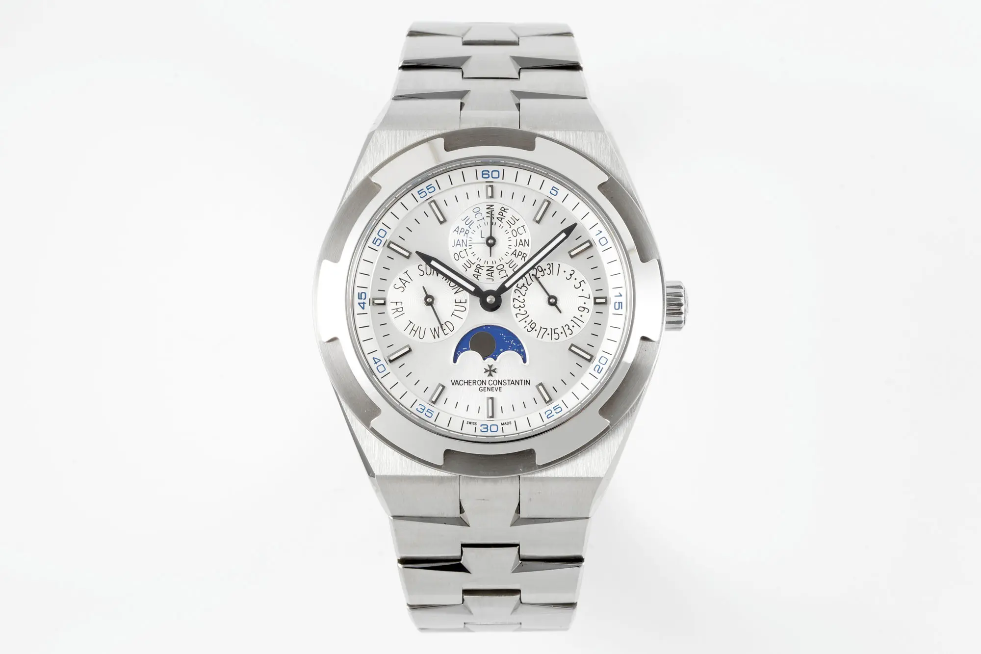 Vacheron Constantin Overseas 4300V Perpetual Calendar Watch – Silver Dial, Stainless Steel Bracelet, Best — Premium 1:1 super clone. Case: 316L stainless steel or 18k gold case. Crystal: Genuine sapphire crystal with AR coating. Movement: Clone Cal. 5100 (28,800 bph, date, power reserve indicator). 12-month movement warranty. Free worldwide shipping on orders over $1,200.