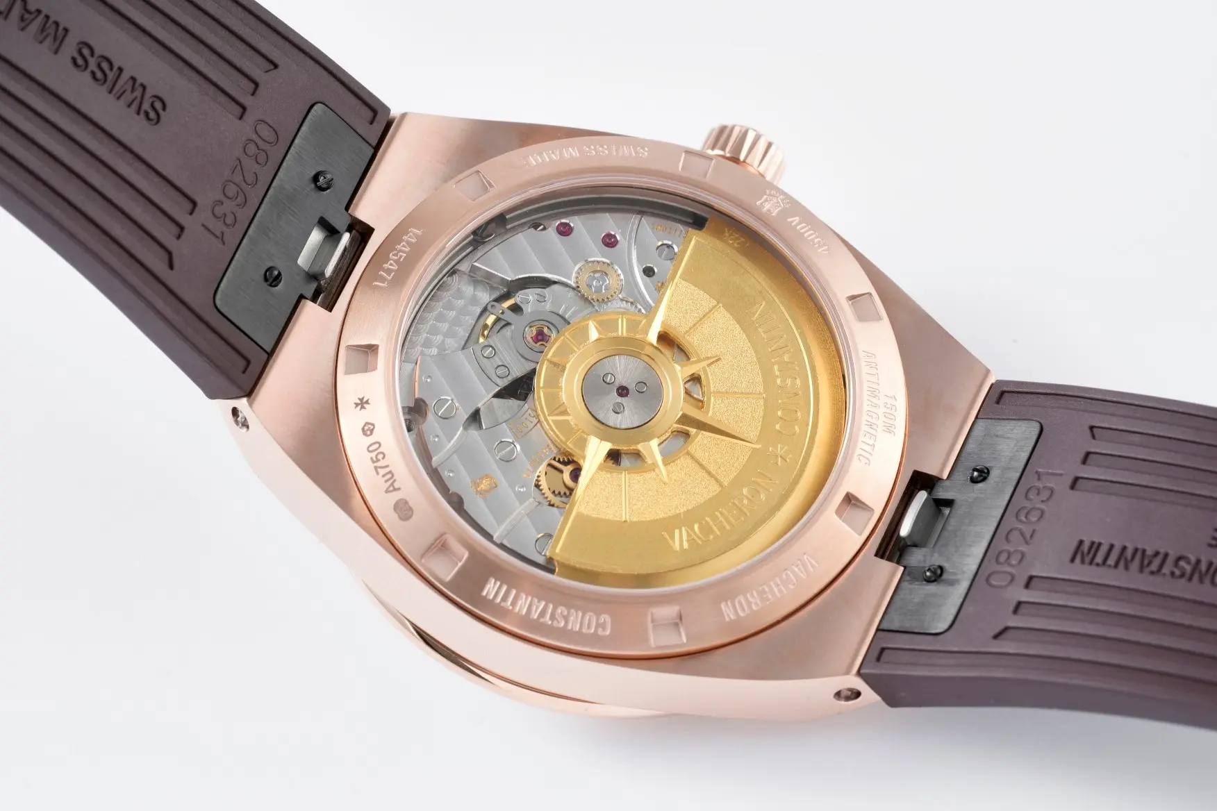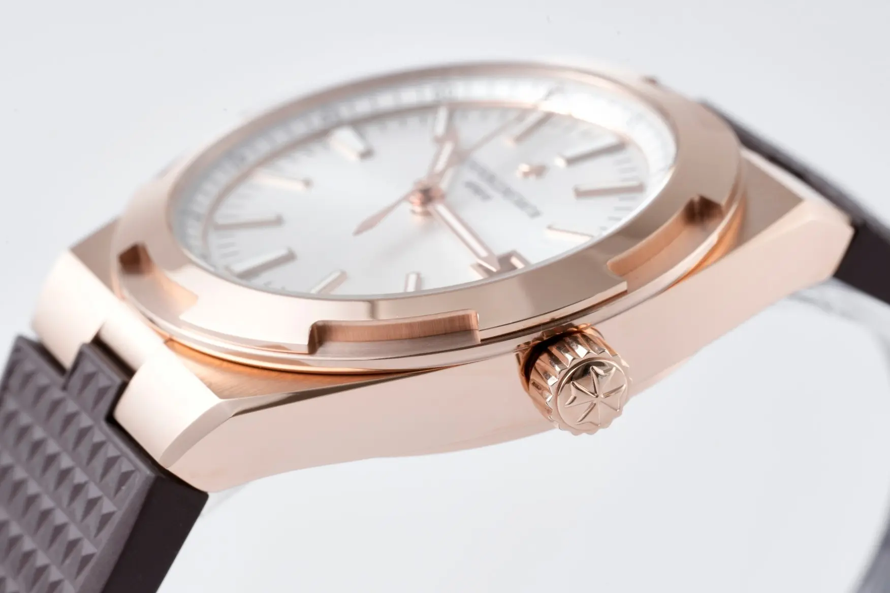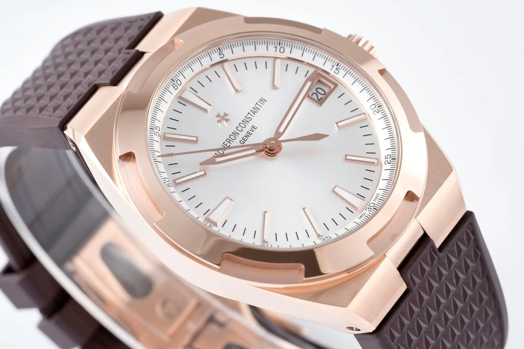 Vacheron Constantin Overseas 4500V Series – Rose Gold Case, Brown Rubber Strap, Luxury Automatic – Quality — Premium 1:1 super clone. Case: 316L stainless steel or 18k gold case. Crystal: Genuine sapphire crystal with AR coating. Movement: Clone Cal. 5100 (28,800 bph, date, power reserve indicator). 12-month movement warranty. Free worldwide shipping on orders over $1,200.