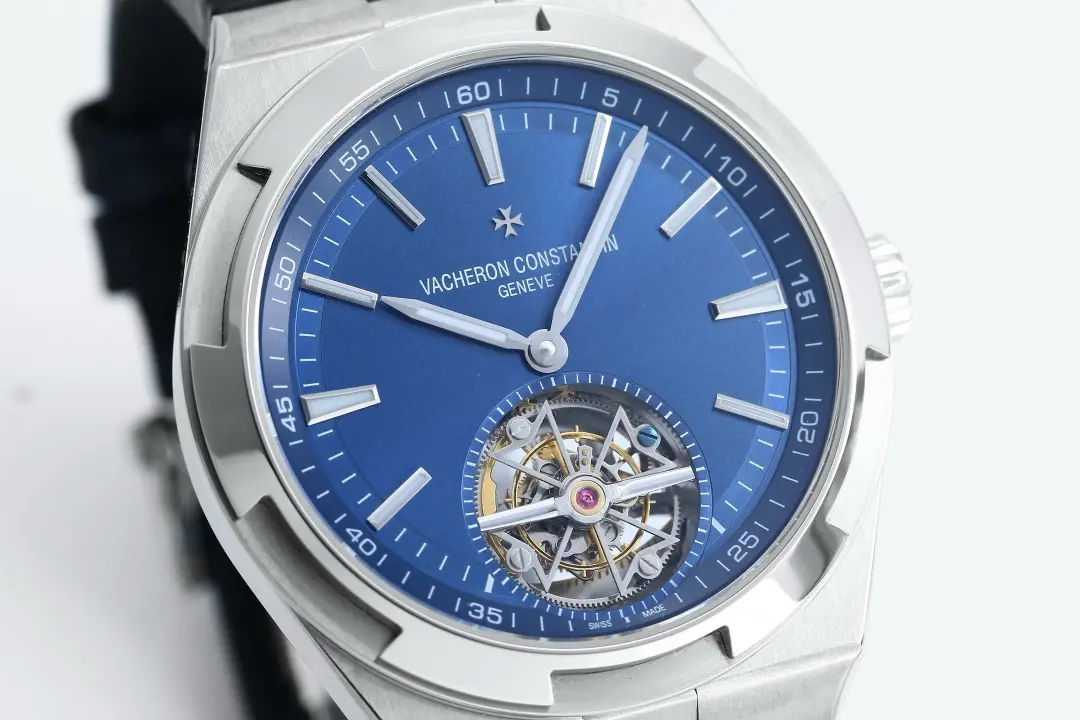 Vacheron Constantin Overseas Tourbillon – Blue Dial, Stainless Steel Case, Leather Strap — Premium 1:1 super clone. Case: 316L stainless steel or 18k gold case. Crystal: Genuine sapphire crystal with AR coating. Movement: Clone Cal. 5100 (28,800 bph, date, power reserve indicator). 12-month movement warranty. Free worldwide shipping on orders over $1,200.