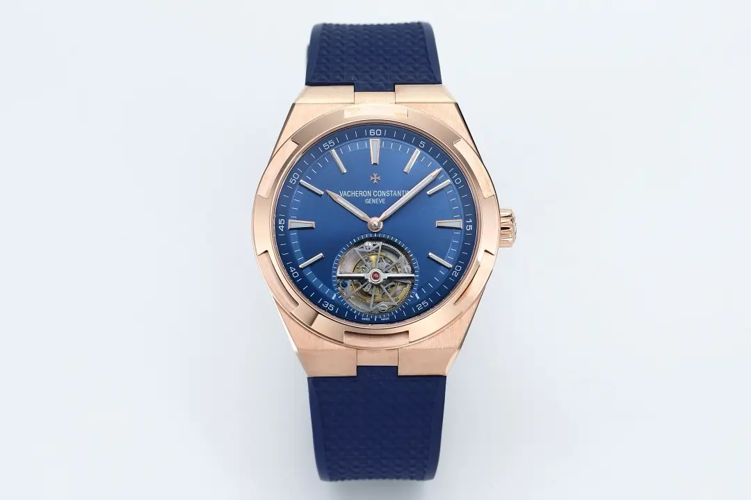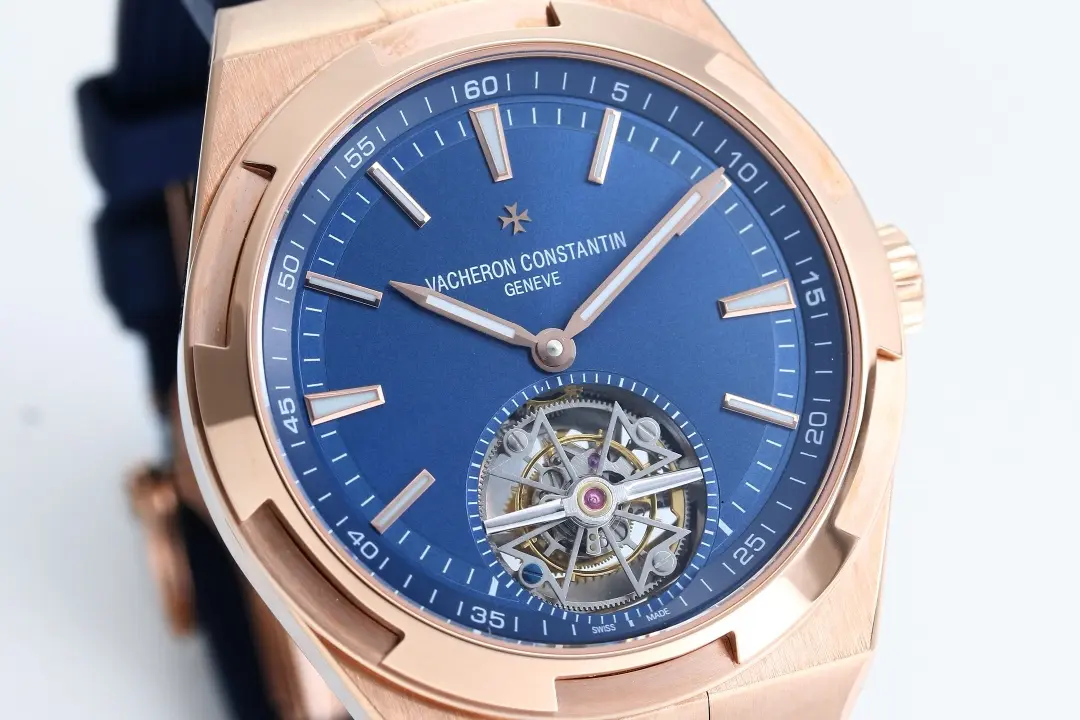Vacheron Constantin Overseas Tourbillon – Rose Gold Case, Blue Dial, Rubber Strap — Premium 1:1 super clone. Case: 316L stainless steel or 18k gold case. Crystal: Genuine sapphire crystal with AR coating. Movement: Clone Cal. 5100 (28,800 bph, date, power reserve indicator). 12-month movement warranty. Free worldwide shipping on orders over $1,200.
